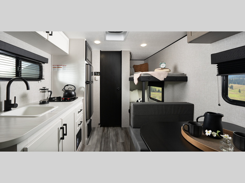Sleeps 5 Length 21 ft 3 in Ext Width 8 ft Ext Height 10 ft 1 in Int Height 6 ft 6 in Interior Color Dune Gray Hitch Weight 250 lbs GVWR 3750 lbs Dry Weight 2885 lbs Cargo Capacity 865 lbs Fresh Water Capacity 30 gals Grey Water Capacity 20 gals Black Water Capacity 20 gals Tire Size ST205/75R14D Furnace BTU 19000 btu Number Of Bunks 2 Available Beds Queen Refrigerator Type 12V Refrigerator Size 5 cu ft Cooktop Burners 2 Shower Size 36" Number of Awnings 1 LP Tank Capacity 20 lbs Water Heater Type Tankless AC BTU 13500 btu Awning Info 10' Power Axle Count 1 Number of LP Tanks 1 Shower Type Tub/Shower Combo Electrical Service 30 amp Similar Floorplans