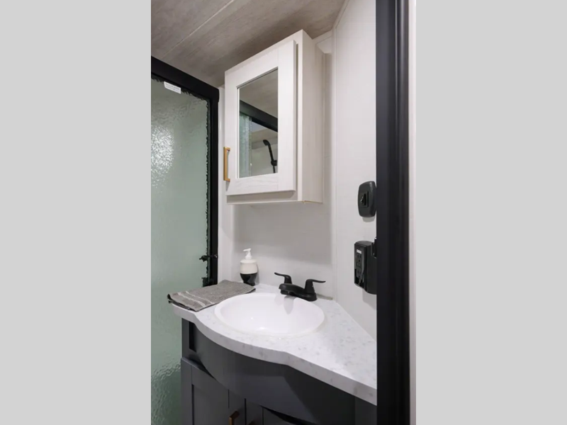 The durable Eternabond construction consists of 2" thick laminated slide boxes, a one-piece roof membrane, radiant foil insulation, and double wiper slide seals for added protection. There are Prime Time exclusive gold solar reflective windows outside, along with one-touch auto leveling, a labeled universal docking center, and more. And you're sure to feel right at home with real wood cabinet doors inside, plus blackout roller shades, soft close cabinetry, and an illuminated lighting package to name a few comforts.
