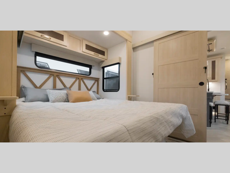 Each luxurious model features real wood cabinet doors, heat rated solid surface countertops throughout, blackout roller shades, and a king-size bed to provide the highest level of owner satisfaction. These fifth wheels also include an electric awning with LED lights outside, as well one-touch auto leveling, doggy d-ring, and a labeled universal docking center to have you set up to camp in no-time!
