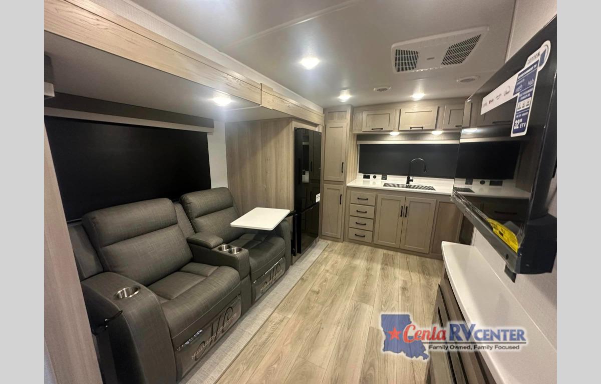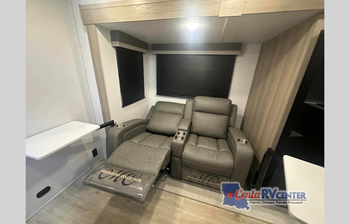 Escape the city life for weekend trips in this cozy couple's trailer. The dual entry doors will allow you to enter in through the rear private bedroom, or the front kitchen/main living area for convenience. You will enjoy relaxing on the theater seating across from the LED TV and fireplace in the evenings, or you can visit outdoors under the 19' power awning. You'll also find an exterior griddle here for quick meals and exterior storage for the fishing poles or hiking gear. This model also includes a walk-through bath with a shower skylight, a linen closet, plus a Showermiser Water Saving System. And don't worry about storage space inside since this model includes an entryway pantry/closet, a second pantry in the front kitchen, plus a large bedroom wardrobe to keep your clothes wrinkle-free!