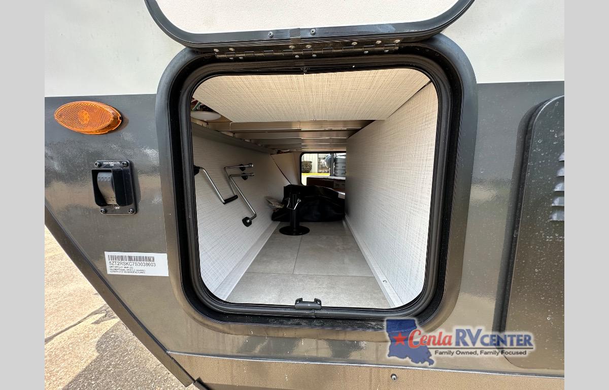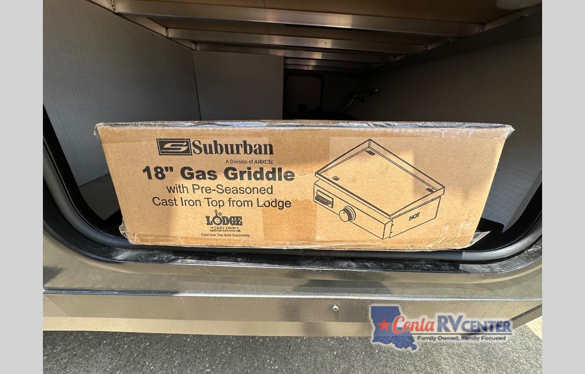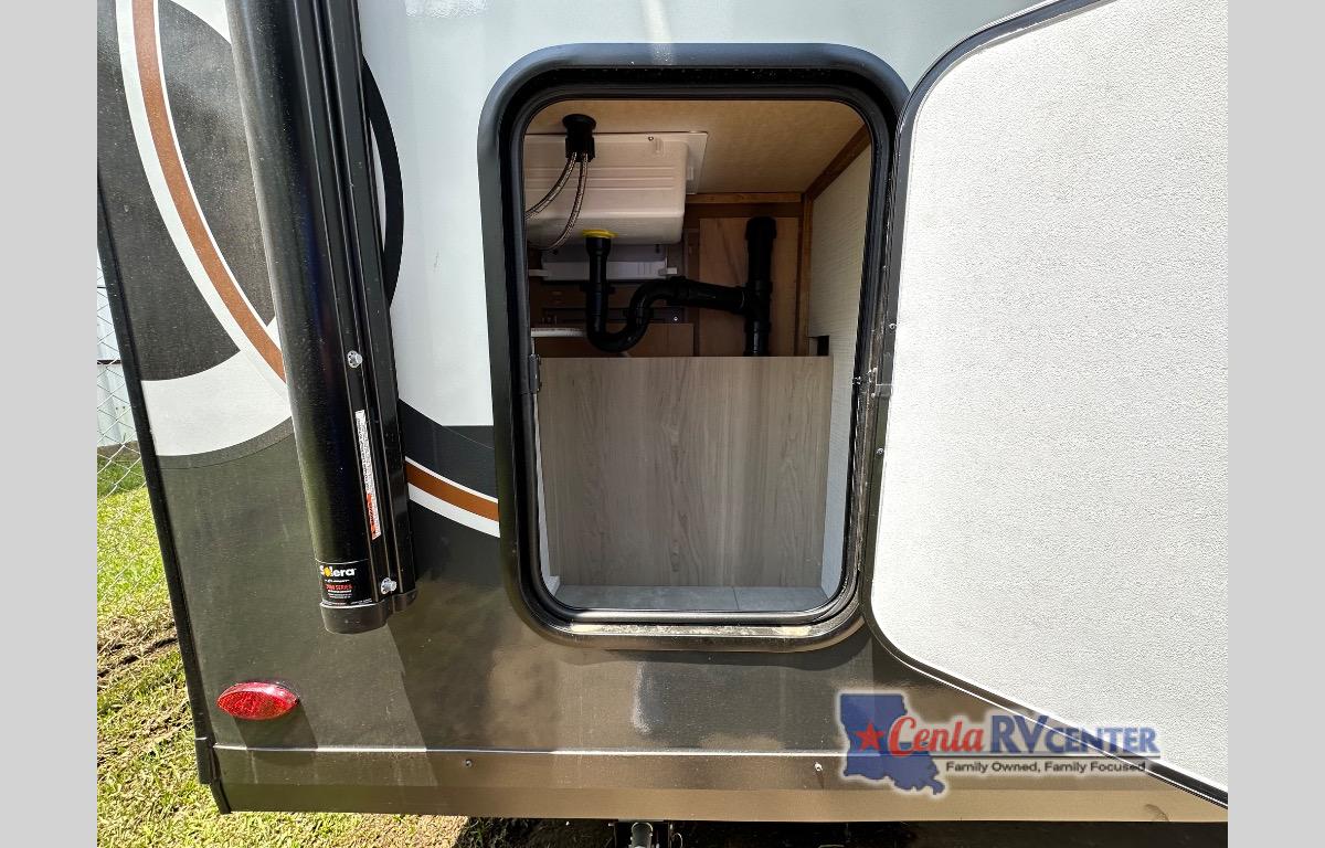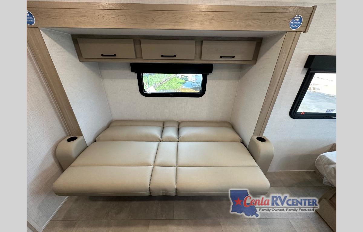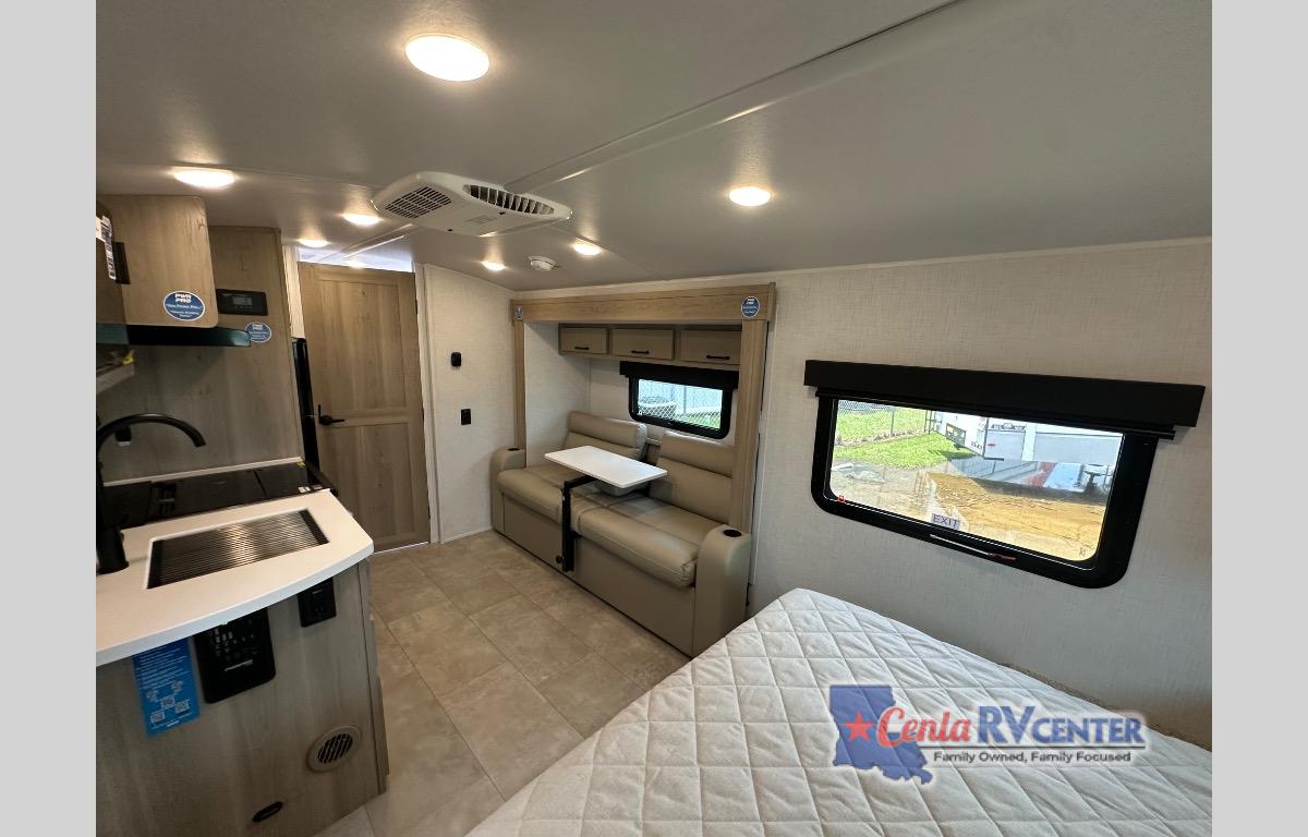 This travel trailer will feel more like home with its front bedroom and walk-around full-size bed. You'll enjoy the 32" 12V TV as you relax on the 72" sofa with a table and cupholders. The full rear bath includes a spacious shower to clean up in each day and there is a linen closet for clean towels. When you're ready to prepare dinner you'll have a three burner cooktop and microwave oven indoors, and a griddle outdoors! And don't forget the exterior storage allows you to bring along beach toys and tackle boxes. The optional Power Package available on this model includes three 200W solar panels, a side solar plug-in, a 3kW 160A inverter, and more off-grid features!