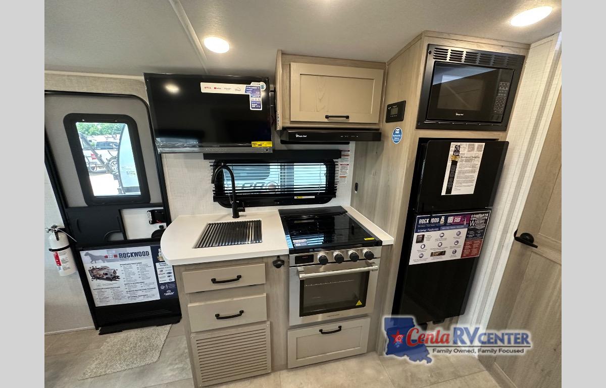 With any Rockwood GEO Pro travel trailer by Forest River you will enjoy easy towing, durable construction, and off-road capabilities with larger 15" tires and a lift kit! Each model is constructed with complete composite wall construction for added strength and durability, and the torsion axle, Rubber-Ryde suspension will make towing easier than ever. Inside, you'll find sleek roller shades for added privacy, a 12V refrigerator and a microwave, plus a 20,000 BTU furnace to keep you warm during the colder camping months.