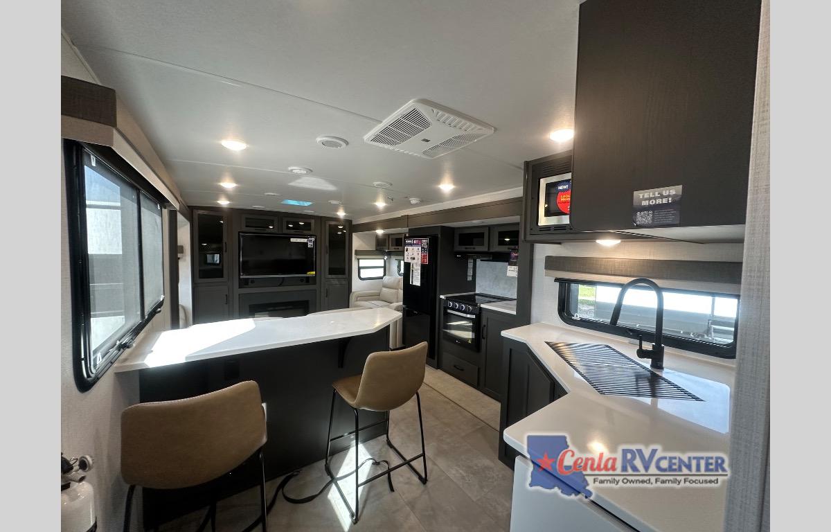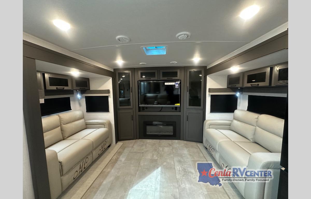 Enjoy trips to the lake in this travel trailer with triple slides! The rear living area includes a rear entertainment center, a 60" theater seat, plus two hide-a-bed sofas, which allows this room to double as your guests' bedroom at night. You'll enjoy the front private bedroom all to yourselves, and the full bath is close by for convenience. The chef of your group will love the full kitchen with a three burner range, a 21" gas oven, and a 12V refrigerator to hold perishables. And don't overlook the exterior with its outside storage, 21' awning, and exterior griddle!