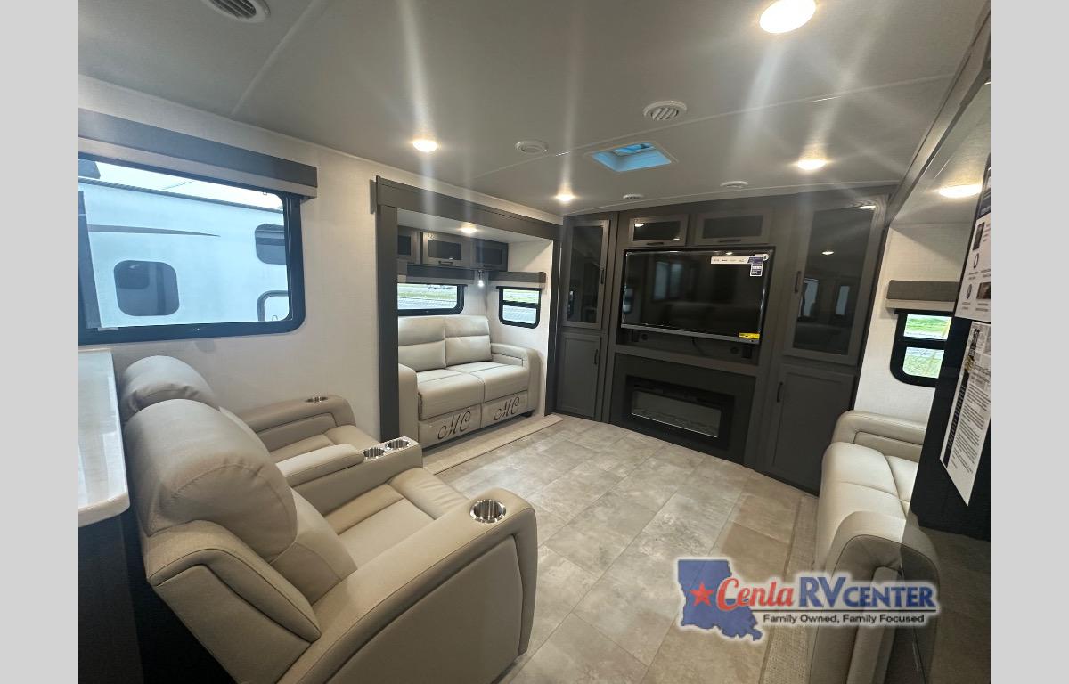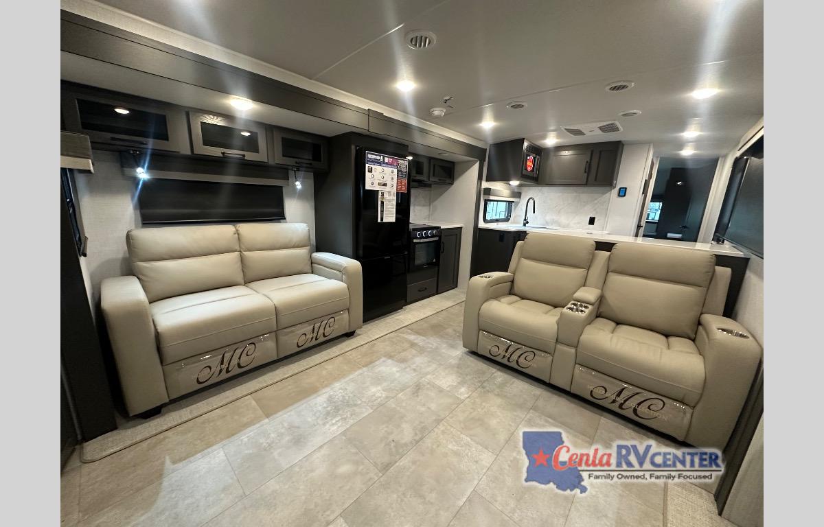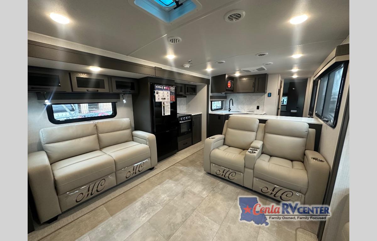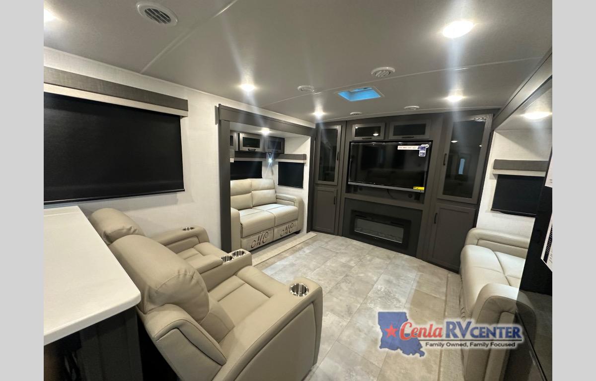 Enjoy trips to the lake in this travel trailer with triple slides! The rear living area includes a rear entertainment center, a 60" theater seat, plus two hide-a-bed sofas, which allows this room to double as your guests' bedroom at night. You'll enjoy the front private bedroom all to yourselves, and the full bath is close by for convenience. The chef of your group will love the full kitchen with a three burner range, a 21" gas oven, and a 12V refrigerator to hold perishables. And don't overlook the exterior with its outside storage, 21' awning, and exterior griddle!