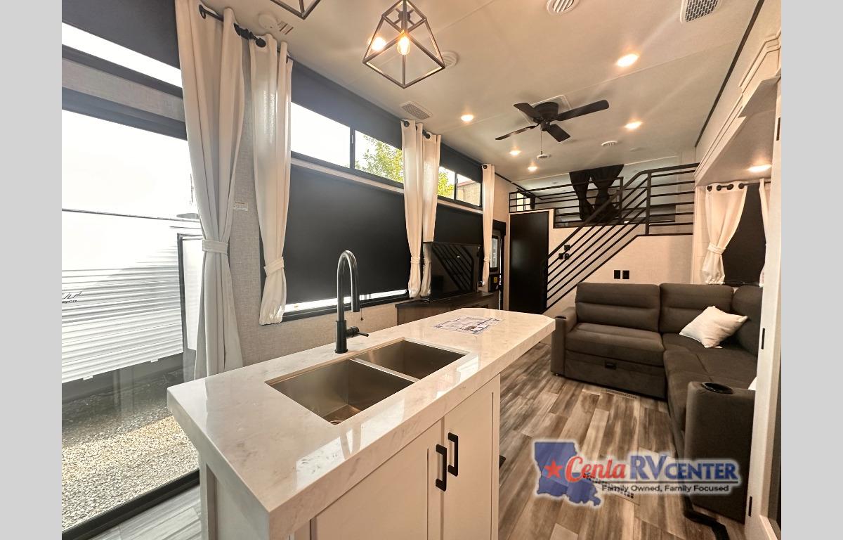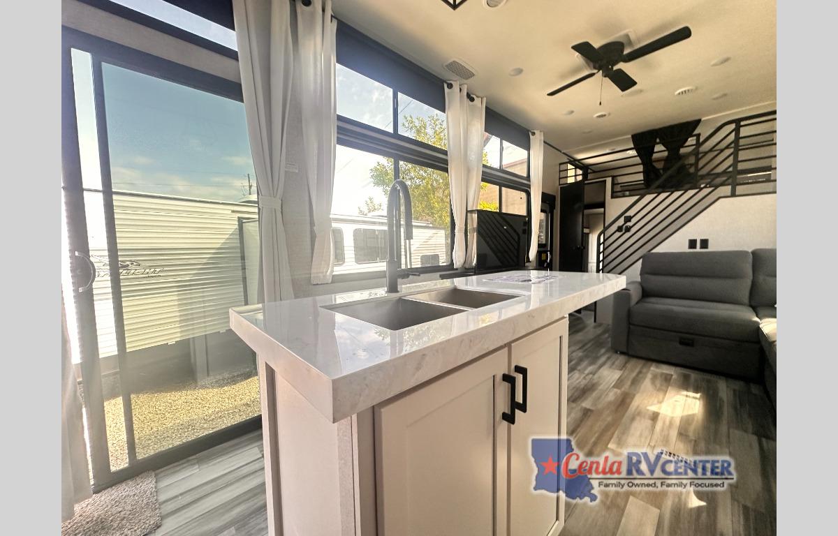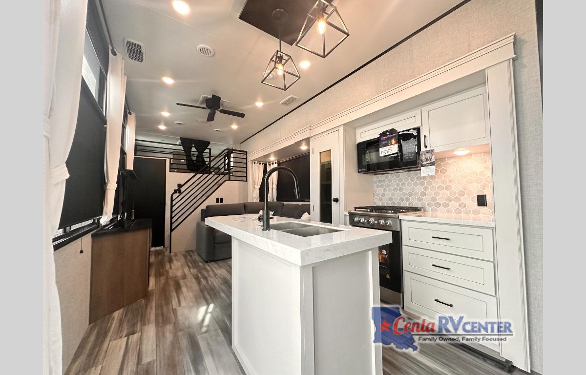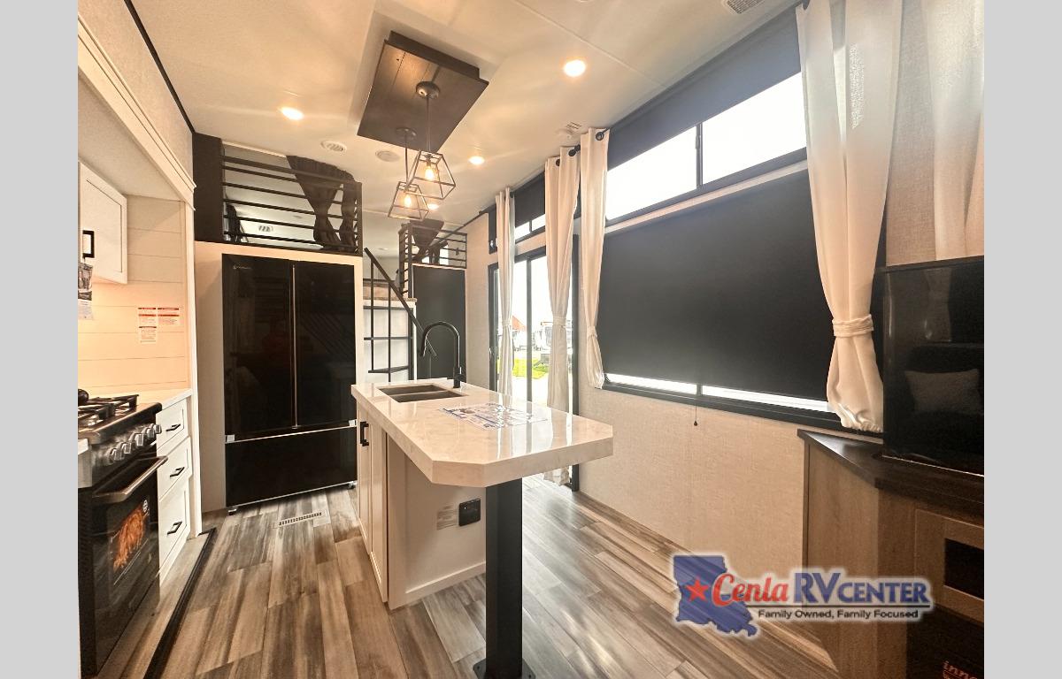 Travel in comfort with your family. You will love having your own bedroom up front with a queen bed, a bench with storage below, plus a dresser and over head cabinet for your things. This unit comes with more space for everyone to sleep for instance the loft area, which has multiple bunk mats where three people can easily fit, or the sectional sofa with hide-a-bed situated in the living room, ideal for two. Also in the living area, you will be able to enjoy the entertainment center, plus, a ceiling fan will keep the air moving while the chef cooks delicious meals in the morning, and you all can dine at the kitchen island which includes bar stools. The Kitchen is also fitted with a residential fridge, microwave, four cooktop burner, sink and pantry perfect to cook with luxury and comfort. Finally, take a bath in the full rear bathroom.