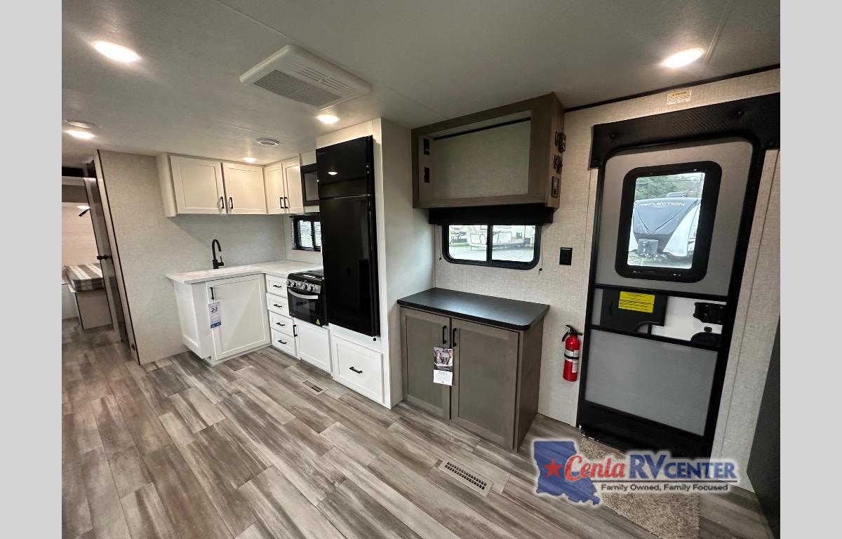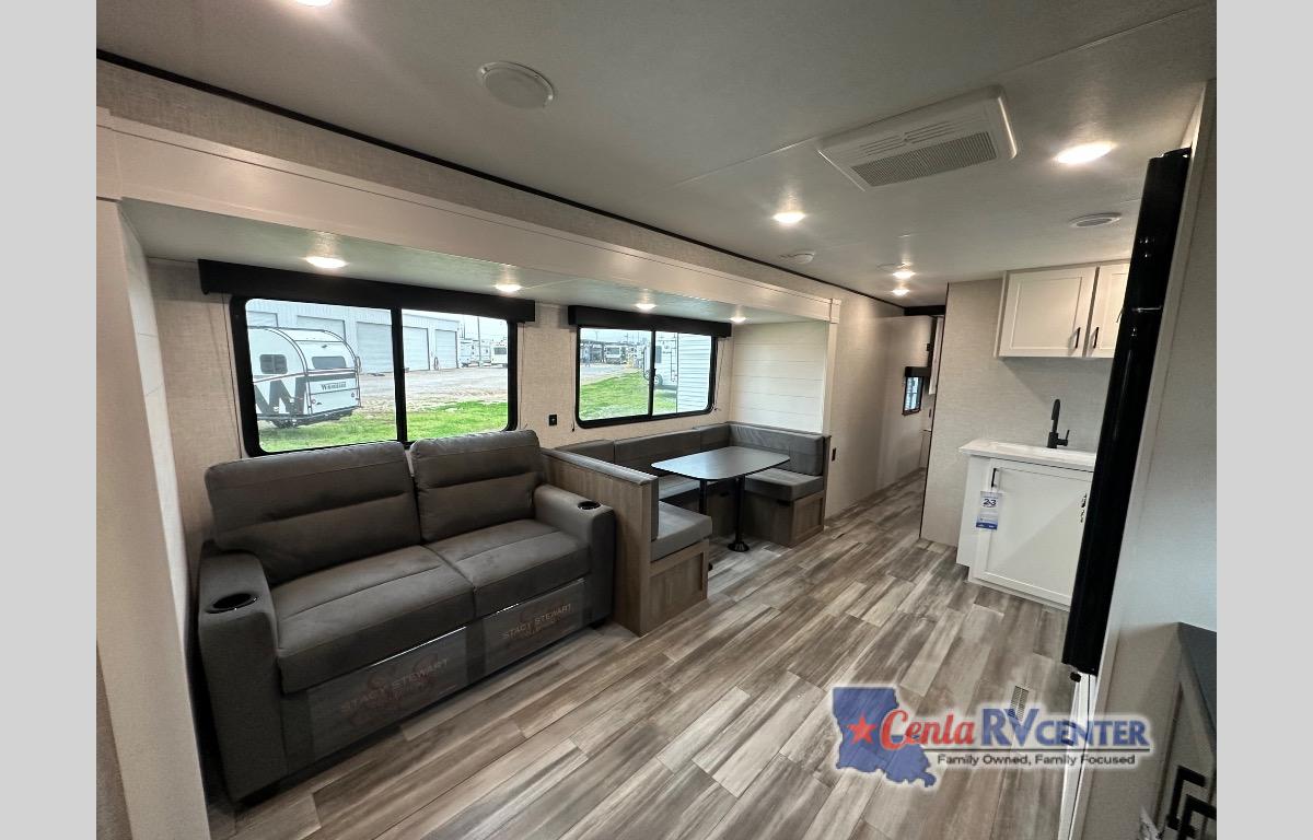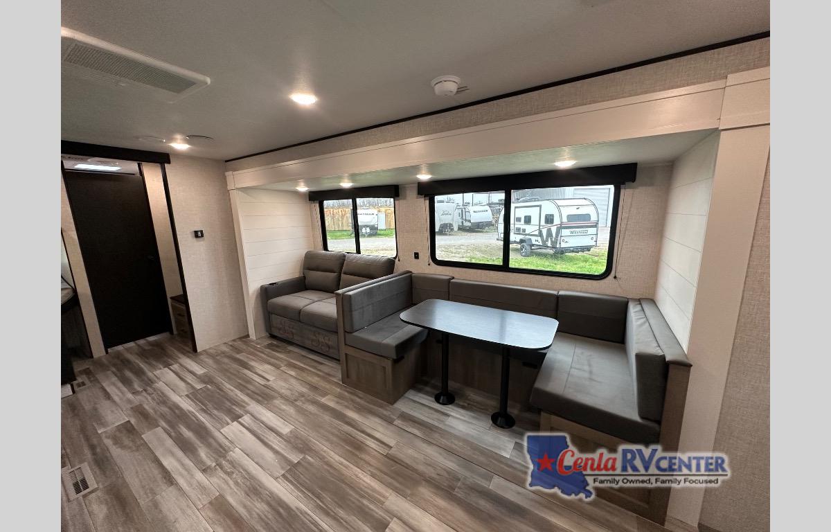 It's time to ditch that old tent and upgrade to this spacious travel trailer! The littles ones or your guests will love the double-size bunks in the rear bunkhouse, along with a half bath and storage space for their things. You'll enjoy the front private bedroom all to yourselves with a queen bed and dual wardrobes, and the full bath is close by for easy nighttime use. A U-shaped dinette slide and sofa in the main living area provide your crew with space to relax and dine together, and the fully equipped kitchen lets you cook up your best meals. Outside, you'll find exterior storage, a 20' power awning, plus an exterior refrigerator, LP Quick Connect, and an exterior spray port!