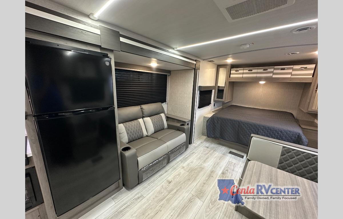 You'll love the added interior space this model has to offer thanks to the large slide out in the main living area. Here, you'll find the tri-fold sofa, the three burner gas range, and the 10 cu. ft. refrigerator. There is a large countertop in the back of this unit that houses the stainless steel sink, and the rear corner bath includes a spacious shower for convenience. You will love having your own space up front in the semi-private bedroom that includes a queen bed, dual closets and nightstands, plus a privacy curtain. There is even a laundry chute so you can throw dirty clothes straight to the pass-through storage!