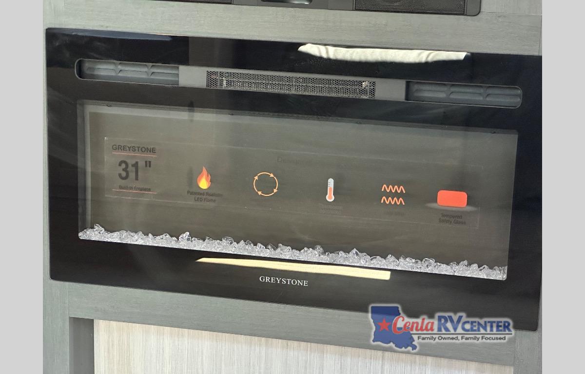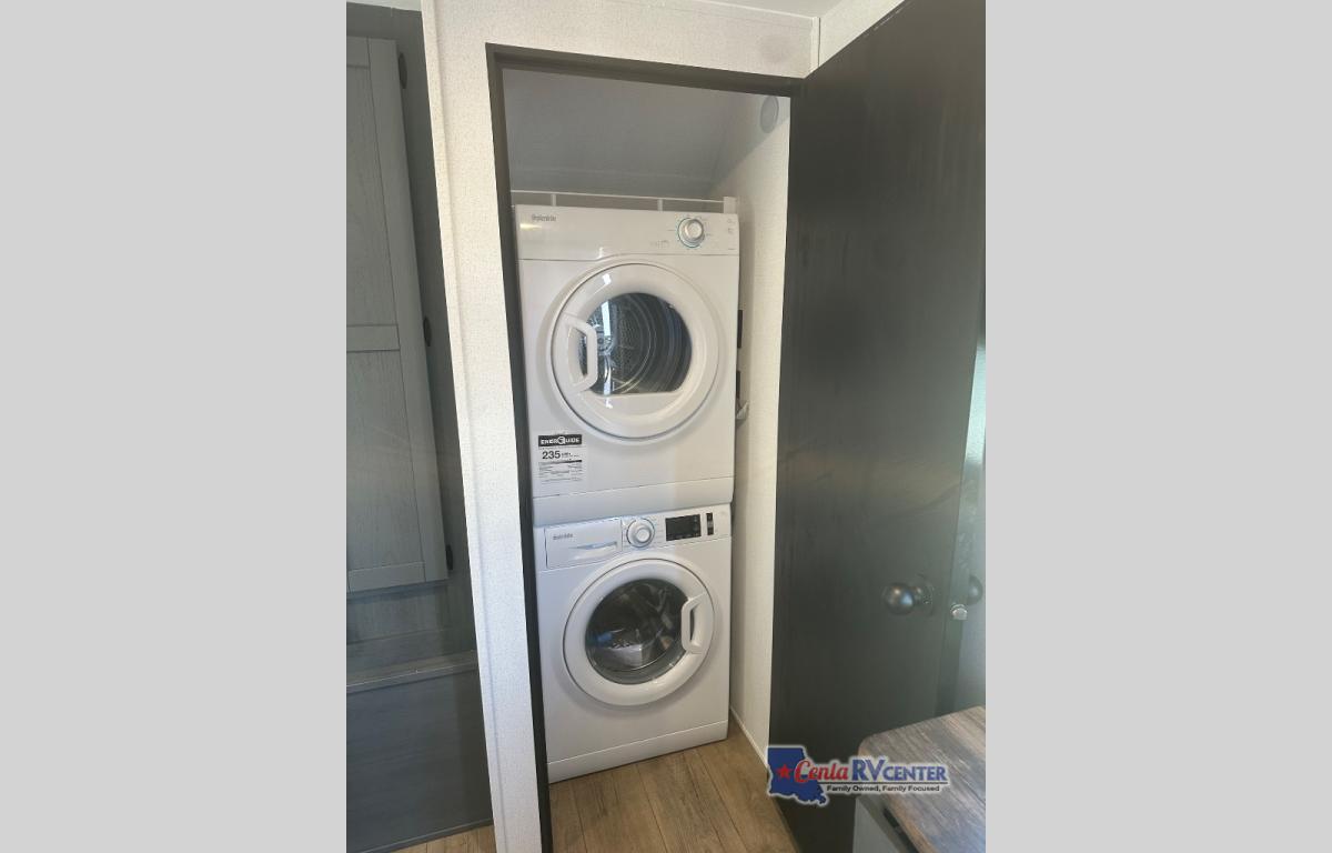 Head to the lake in this double slide out travel trailer that can sleep four to five each night. You will love having the front private bedroom all to yourselves that includes a queen bed slide out, a front wardrobe, a closet with washer and dryer prep, plus your own exterior entry door. Your guests can sleep on the sofa and booth dinette within the second slide out, and the full rear bath is tucked away for privacy. This model also includes an entryway closet/pantry for food storage and jackets, and the fireplace across from the sofa makes your space more cozy. An optional outside micro kitchen is available also if you like to cook outdoors!