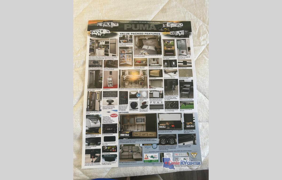 If you're looking for family-fun adventures then you need one of these Palomino Puma fifth wheels or travel trailers! They are built rugged, easy to tow, and jam packed with features. The Darco wrapped underbelly will protect your units vitals and the AlphaPly roofing membrane covers it. They also have new aluminum wheels and a powder coated steel I-beam frame. Inside, the Congoleum linoleum will be easy to keep clean, and the night roller shades will provide privacy when it's time to turn in. You'll also enjoy an electric awning with an LED light strip plus an AM/FM/Bluetooth stereo and two outside speakers to keep the party going!