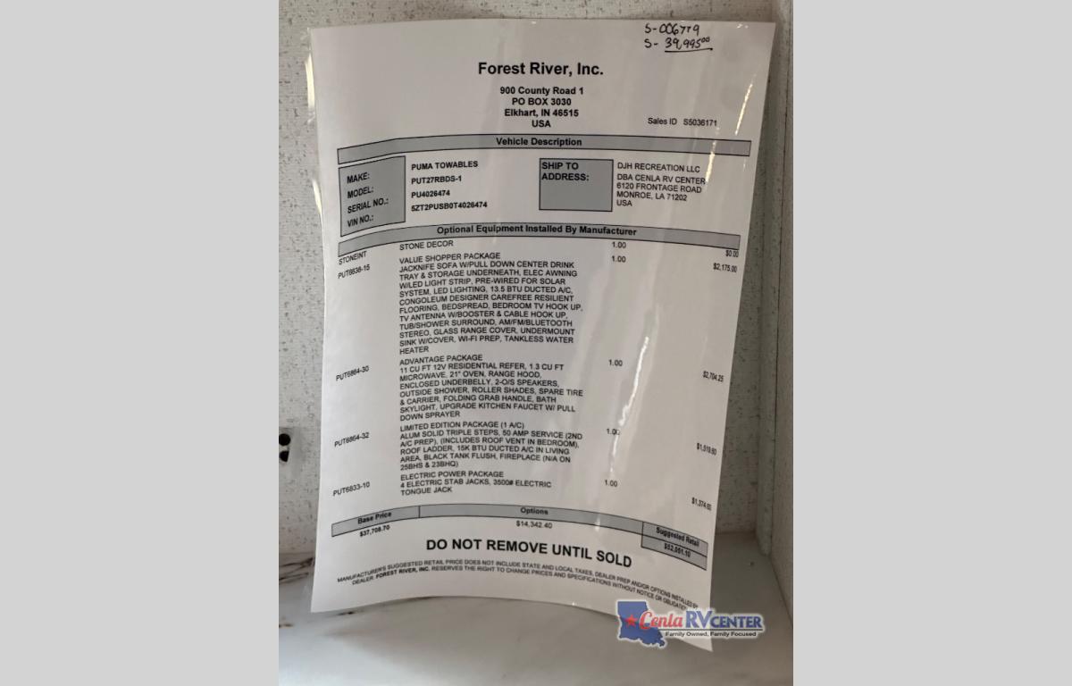 Cenla Camping Center is not responsible for any misprints, typos, or errors found in our website pages. Any price listed excludes sales tax, registration tags, and delivery fees. Manufacturer-provided pictures, specifications and features may be used as needed. Inventory shown may be only a partial listing of the entire inventory. Please contact us at 318-445-6981 for availability as our inventory changes rapidly. All calculated payments are an estimate only and do not constitute a commitment that financing or a specific interest rate or term is available.