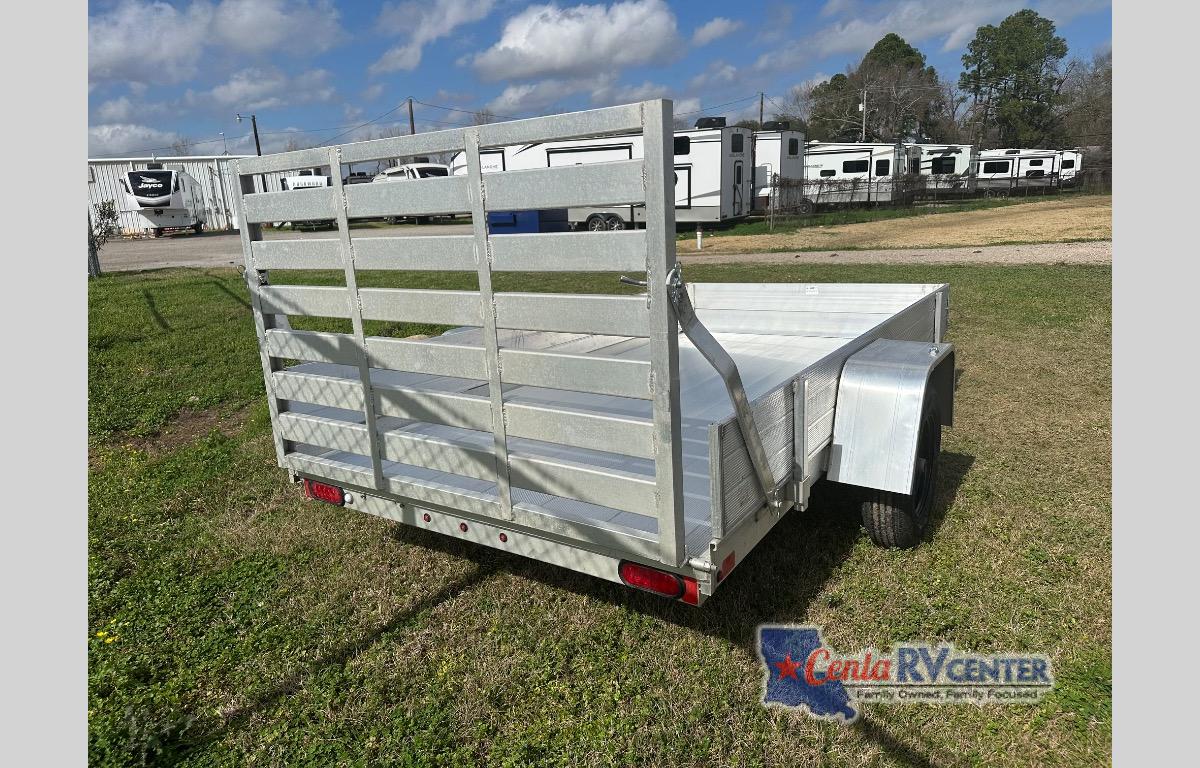 • 2000# Rubber torsion axle - No brakes - Easy lube hubs • ST175/80R13 Radial tires • Steel wheels, 5-4.5 BHP • 12" Solid side kit • Aluminum fenders • Extruded aluminum floor • 6" Front retaining bumper • A-Framed aluminum tongue, 48" long with 2" coupler • 4) Stake pockets (2 per side) • 4) Tie down loops (2 per side) • Swivel tongue jack, 1200# capacity • LED Lighting package, safety chains • Aluminum tailgate - 50.25" x 39" long • Overall width = 84.5" • Overall length = 168"