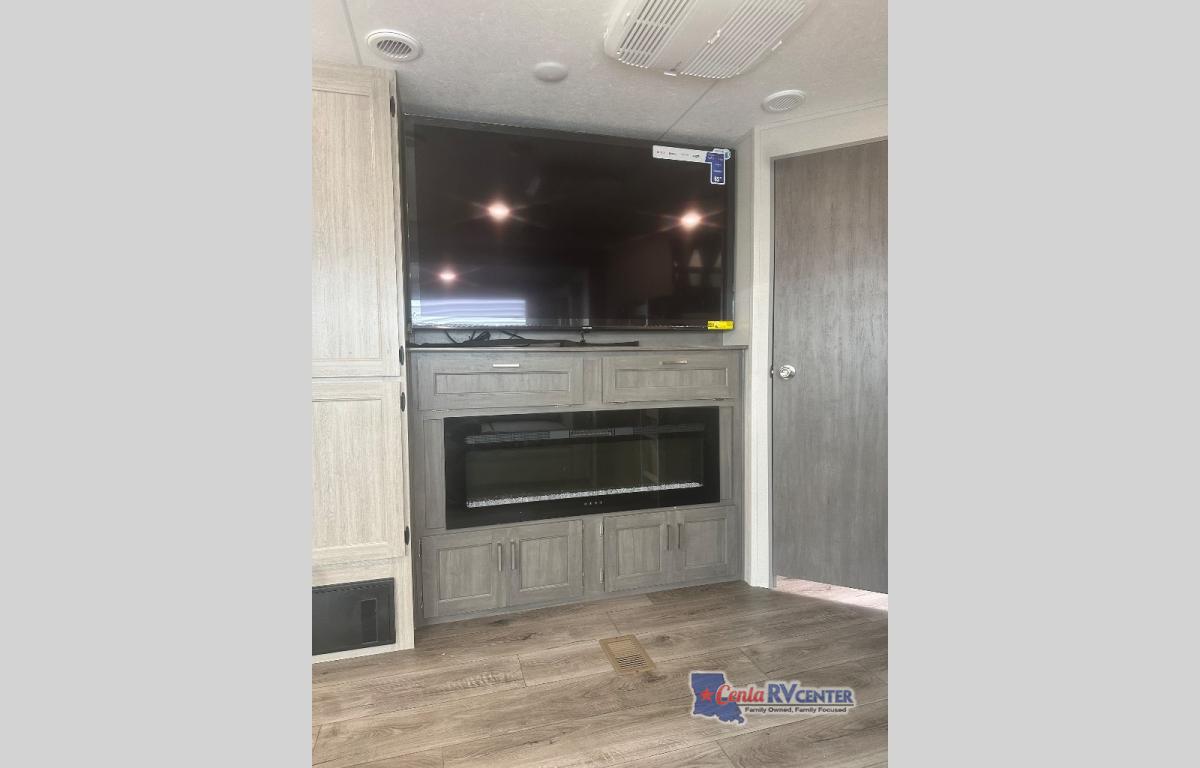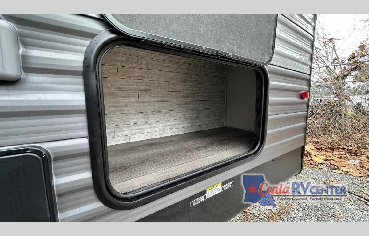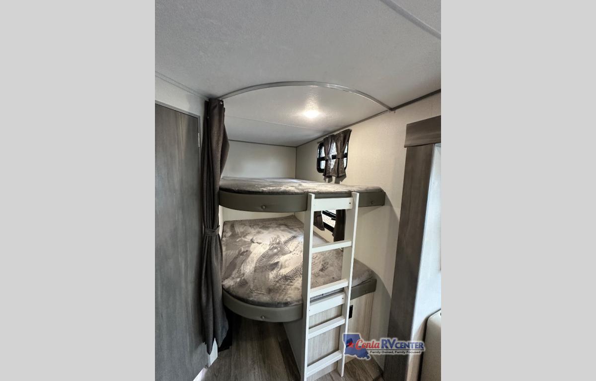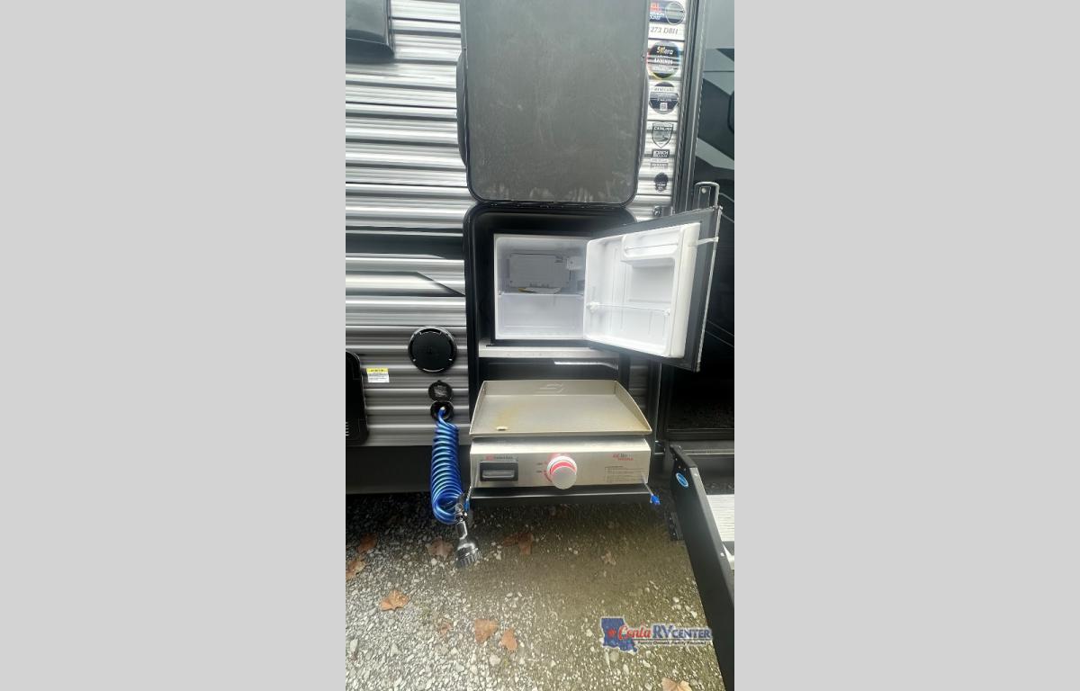 This travel trailer is perfect for your whole crew! Once you arrive at the campground, you can put out the 21' electric awning and start lunch on the exterior camper kitchen with a griddle and mini fridge. There is also a pass-thru storage plus additional exterior storage with a fold-down table and a TV hookup for added convenience. And since there are dual entry doors found on this unit, you can enter in through the full bath in the back, or the main living area towards the front! A large slide provides ample space to move about, and you'll find a trundle sofa and U-shaped dinette here for cozy seating and sleeping space. Speaking of sleeping, there is a front RV queen bed in the bedroom plus double-size bunks in the back for guests!