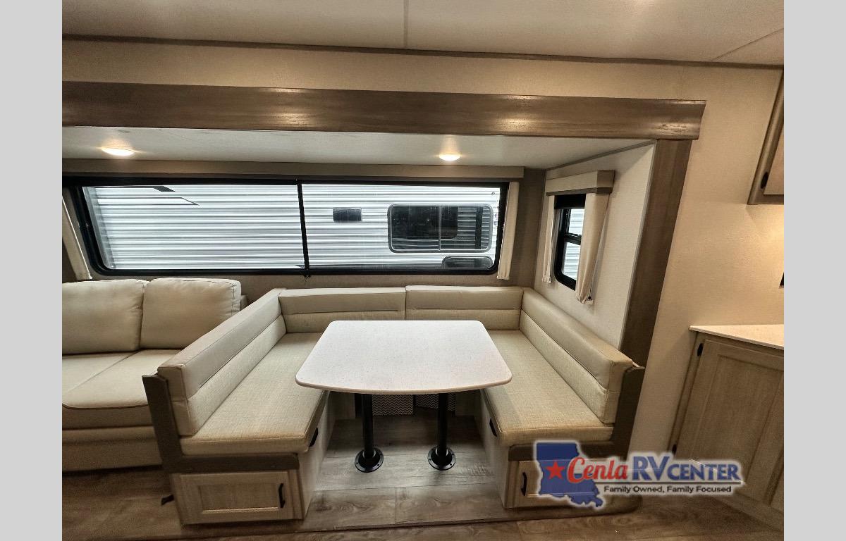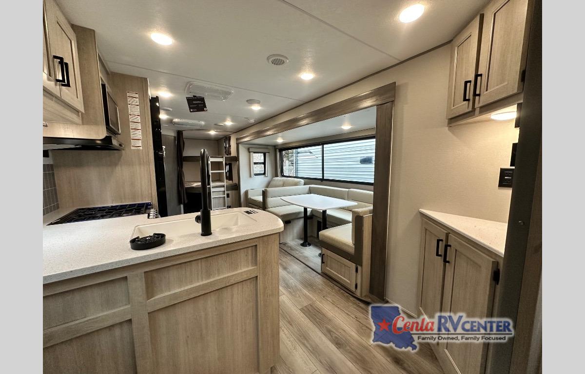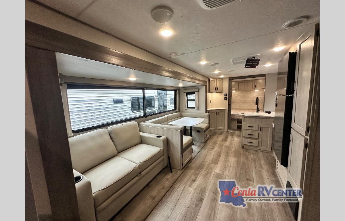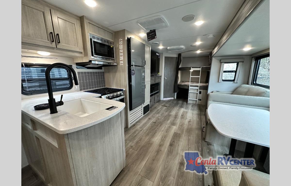 This travel trailer is perfect for your whole crew! Once you arrive at the campground, you can put out the 21' electric awning and start lunch on the exterior camper kitchen with a griddle and mini fridge. There is also a pass-thru storage plus additional exterior storage with a fold-down table and a TV hookup for added convenience. And since there are dual entry doors found on this unit, you can enter in through the full bath in the back, or the main living area towards the front! A large slide provides ample space to move about, and you'll find a trundle sofa and U-shaped dinette here for cozy seating and sleeping space. Speaking of sleeping, there is a front RV queen bed in the bedroom plus double-size bunks in the back for guests!