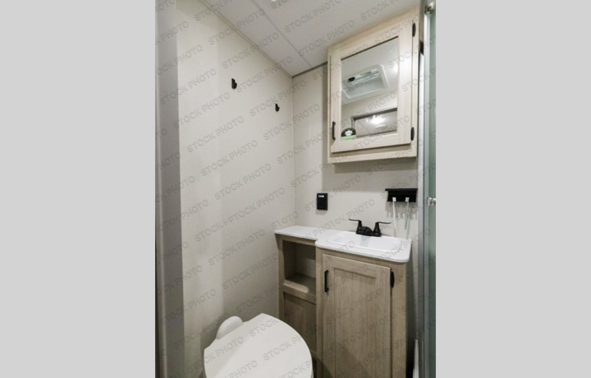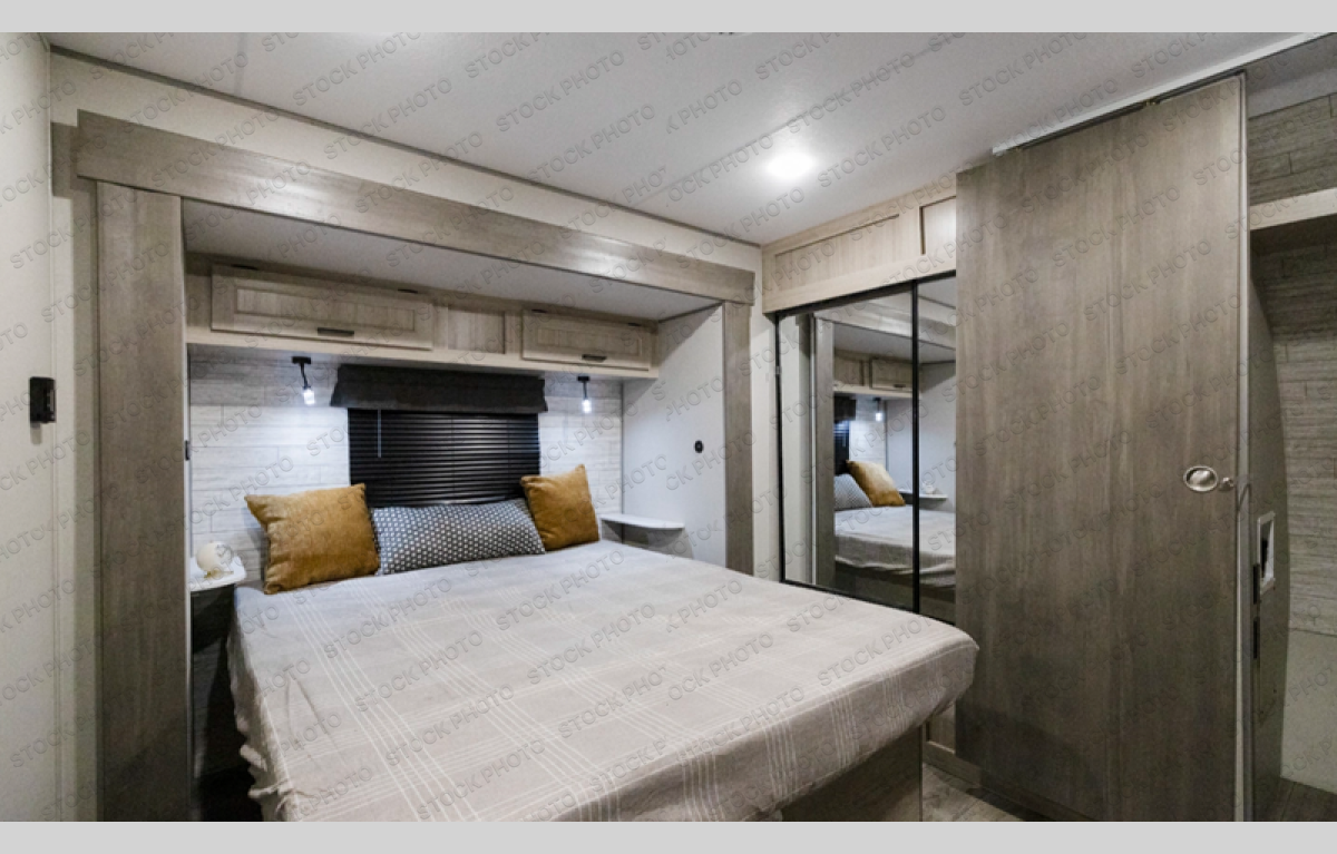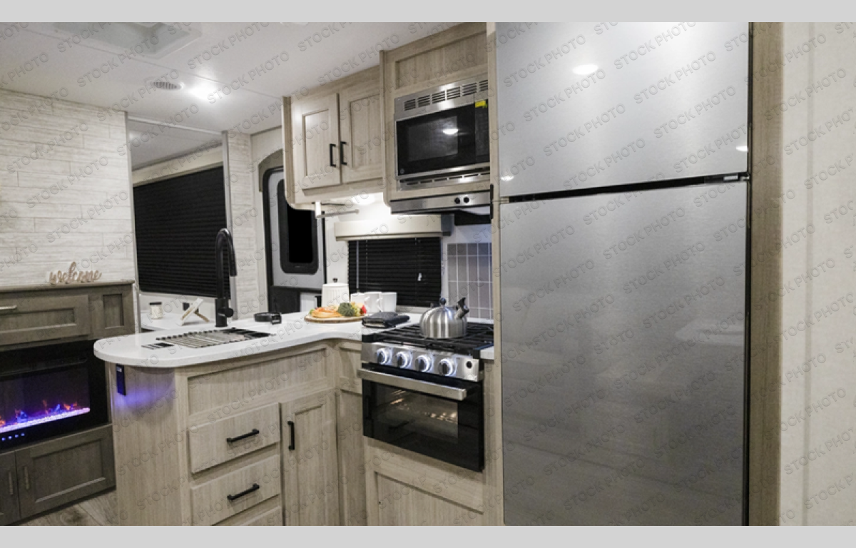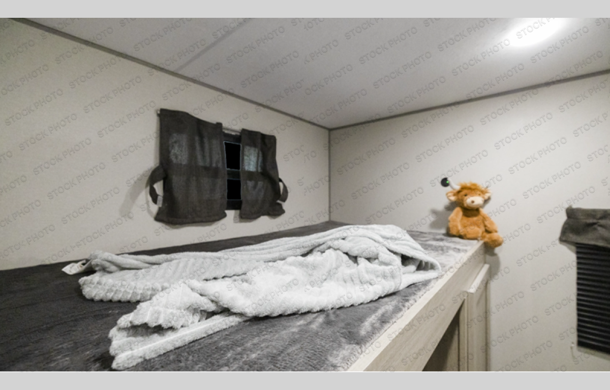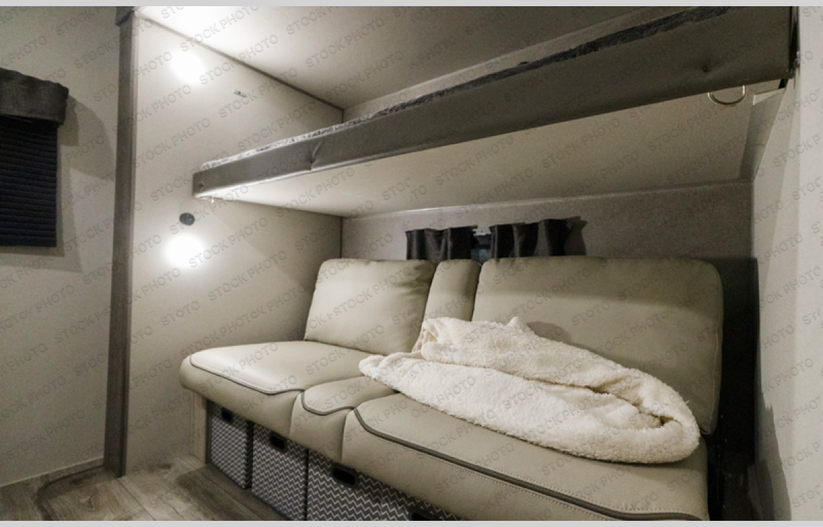 This family-friendly trailer offers lots of floor space thanks to the triple slides throughout! You and your family will love the combined living and kitchen area with a slide out booth dinette and a sofa with drink holders. The L-shaped kitchen counter allows the cook to make meals without moving for anyone trying to get to the full bathroom or the rear bunkhouse. The kids will have their own privacy, two bunk beds, a jack knife sofa with storage totes below plus a TV/wardrobe cabinet. The front private bedroom allows you to sleep like royalty and offers a large closet for your clothing and another closet prepped for a washer/dryer. And don't forget about the full-size camper kitchen and the 21' power awning with multicolor LED lights when you are outside.