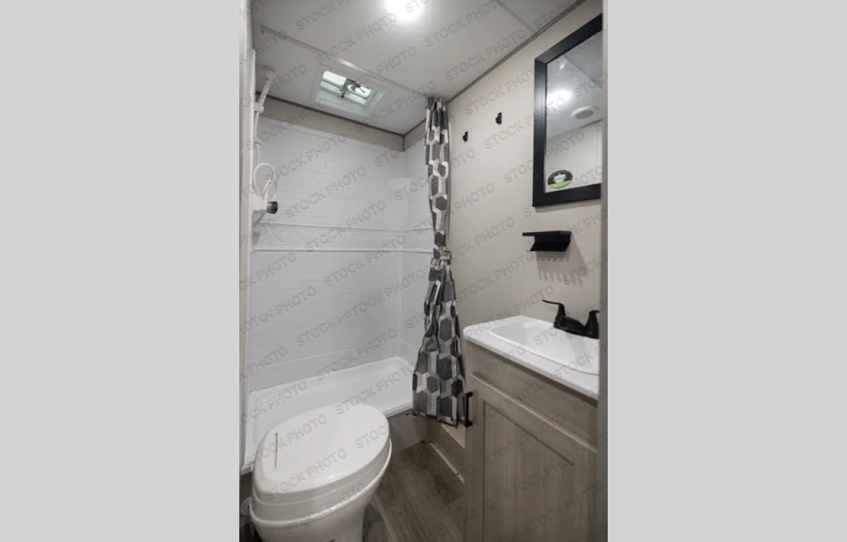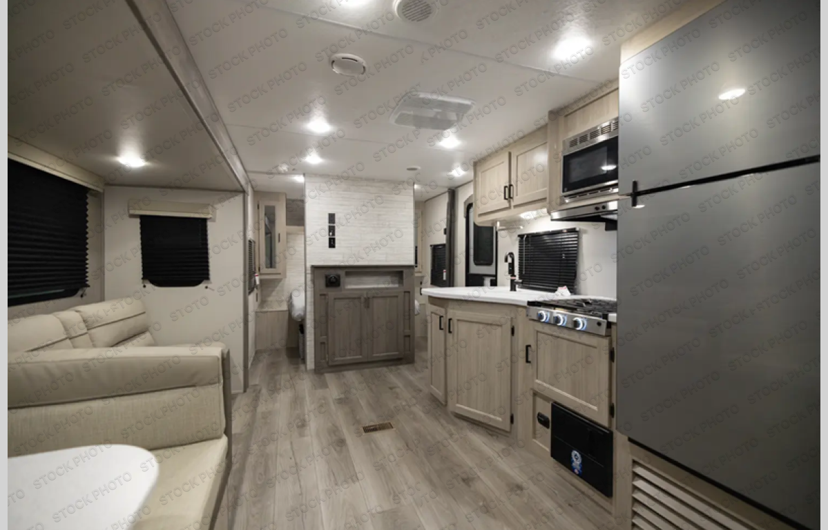 This is the perfect mid-size travel trailer for you and your family! The 46" x 74" double-size bunk beds with lower interior storage offer a comfortable sleeping space for the kids and you will have your own private sleeping space with the 60" x 74" queen bed in the front bedroom. Freshen up each morning in the rear corner bathroom with the tub/shower and a mirror to get ready each morning. You can prepare your best home cooked meals with the GE stainless three burner cooktop and GE stainless 10.7 cu. ft. 12V refrigerator, then enjoy them together at the booth dinette. The sofa is near the entertainment center for a relaxing movie night. Don't leave any of your outdoor gear behind either, thanks to the front pass-through storage area and the exterior outside storage area. You could even add the optional outside camper kitchen to grill the catch of the day on the pull out griddle!