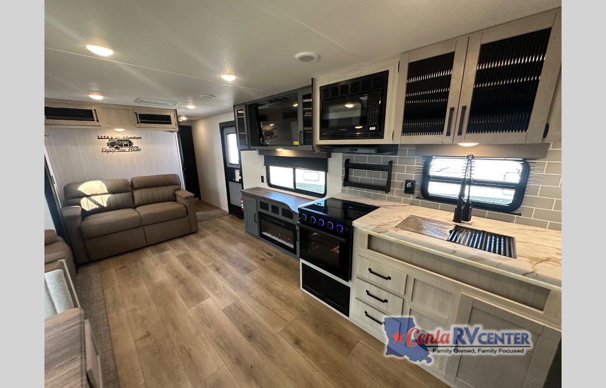 You won't want to camp any other way once you step inside this travel trailer! The rear kitchen has a stainless steel oven and range to prepare your best meals, a 12V refrigerator to keep your perishables fresh, and a walk-in pantry for your canned goods and snacks for movie night. After a fun day at the beach, you can play a card game at the booth dinette, relax in either one of the two recliners and sofa, or rinse the sand out of your hair in the 32" x 40" shower with a seat in the full bathroom. There is also a front private bedroom with a queen bed slide across from a dresser and a front closet with another closet with washer and dryer prep.