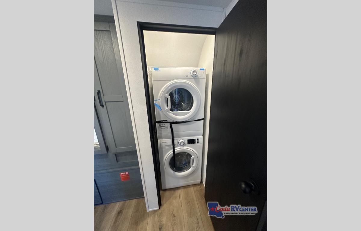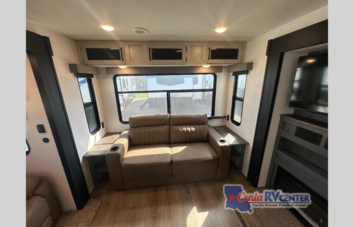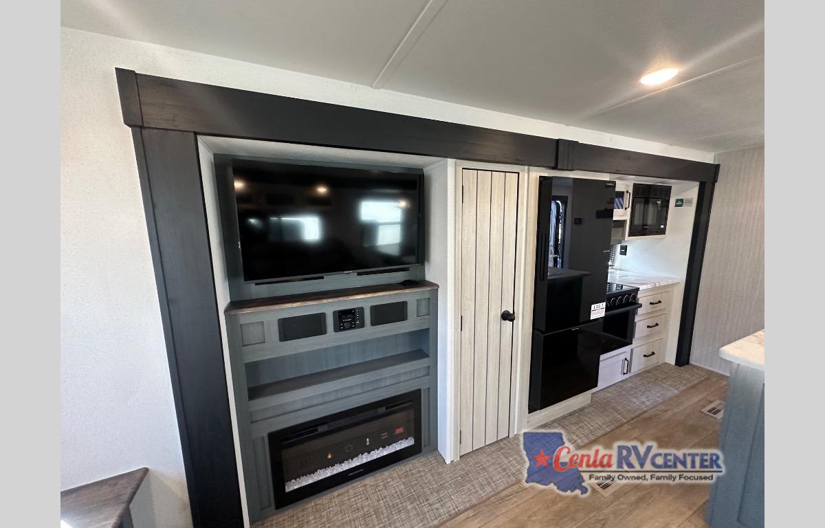 You're going to feel right at home in this travel trailer! The front private bedroom has a queen bed slide for a good night's rest, a dresser and front closet for your clothes, and another closet with washer and dryer prep. Freshen up each morning in the full bathroom with the 32" x 40" shower with a seat and then head to the kitchen to fry up some eggs on the stainless steel oven and range. You will also appreciate having a kitchen island for easier meal prep and a walk-in pantry to easily see your canned goods and snacks. The booth dinette offers a comfortable place to dine, play, and even sleep once converted. What better way to wind down your nights than to relax on either the rear sofa or in one of the two recliners across from the entertainment center with a fireplace!