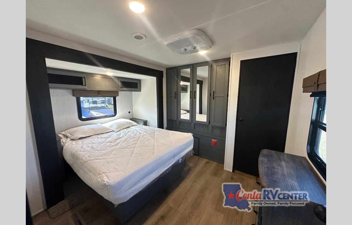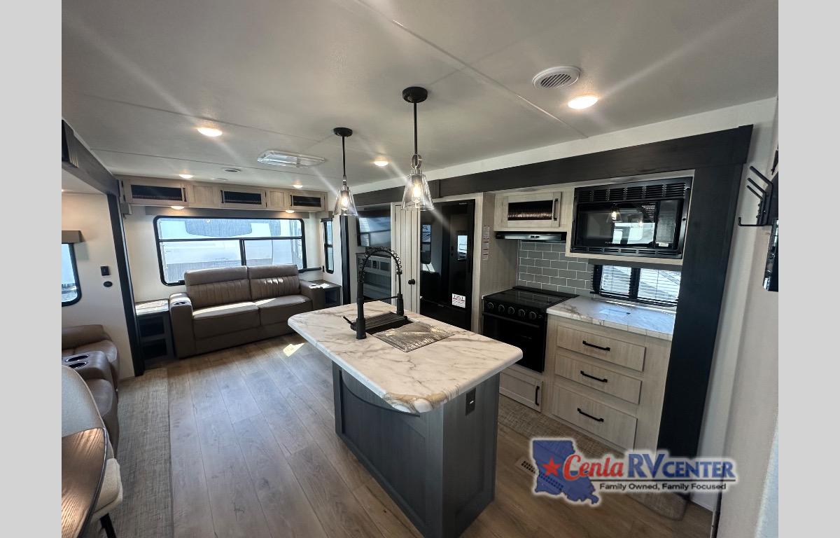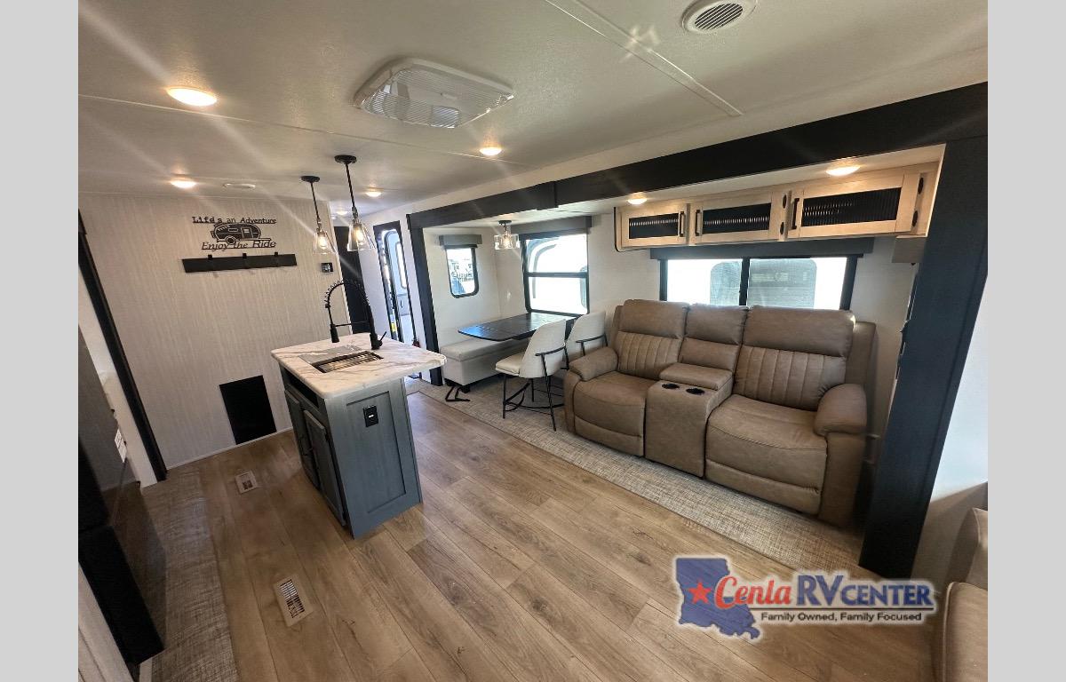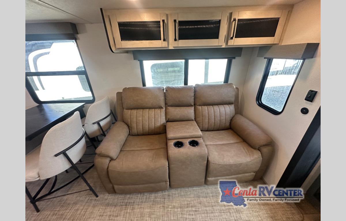 You're going to feel right at home in this travel trailer! The front private bedroom has a queen bed slide for a good night's rest, a dresser and front closet for your clothes, and another closet with washer and dryer prep. Freshen up each morning in the full bathroom with the 32" x 40" shower with a seat and then head to the kitchen to fry up some eggs on the stainless steel oven and range. You will also appreciate having a kitchen island for easier meal prep and a walk-in pantry to easily see your canned goods and snacks. The booth dinette offers a comfortable place to dine, play, and even sleep once converted. What better way to wind down your nights than to relax on either the rear sofa or in one of the two recliners across from the entertainment center with a fireplace!
