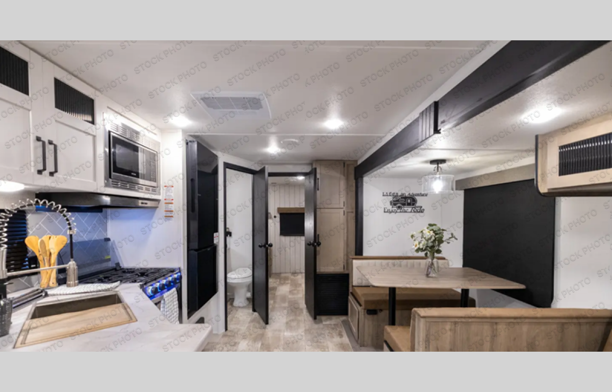 With dual entry doors and a bath and a half, you will have the ultimate in convenience with this travel trailer! The bedroom also has a front closet to keep your clothes looking their best and a queen bed slide for you to sleep your best. Everyone can freshen up in the full bathroom with the 34" x 34" radius shower and fill their bellies with scrambled eggs cooked with the stainless steel oven and range. Enjoy your meals, play games, and even sleep at the booth dinette or relax on the sofa while watching a movie with the entertainment center and fireplace. And your guests will love the rear private bunkhouse with three bunks, a jiffy sofa, and a slide out for more space! This model also includes an optional outside mini kitchen with a griddle!