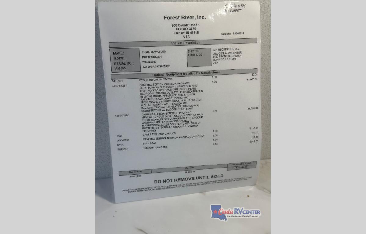 Cenla Camping Center is not responsible for any misprints, typos, or errors found in our website pages. Any price listed excludes sales tax, registration tags, and delivery fees. Manufacturer-provided pictures, specifications and features may be used as needed. Inventory shown may be only a partial listing of the entire inventory. Please contact us at 318-445-6981 for availability as our inventory changes rapidly. All calculated payments are an estimate only and do not constitute a commitment that financing or a specific interest rate or term is available.