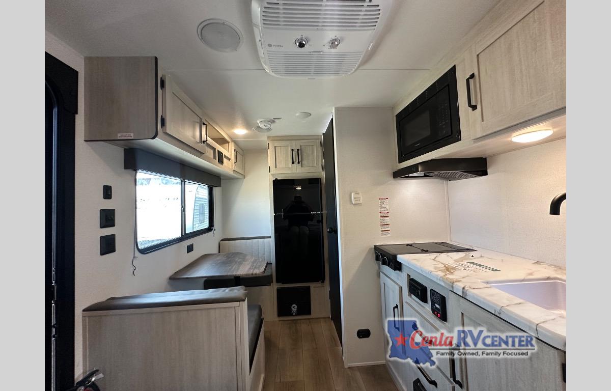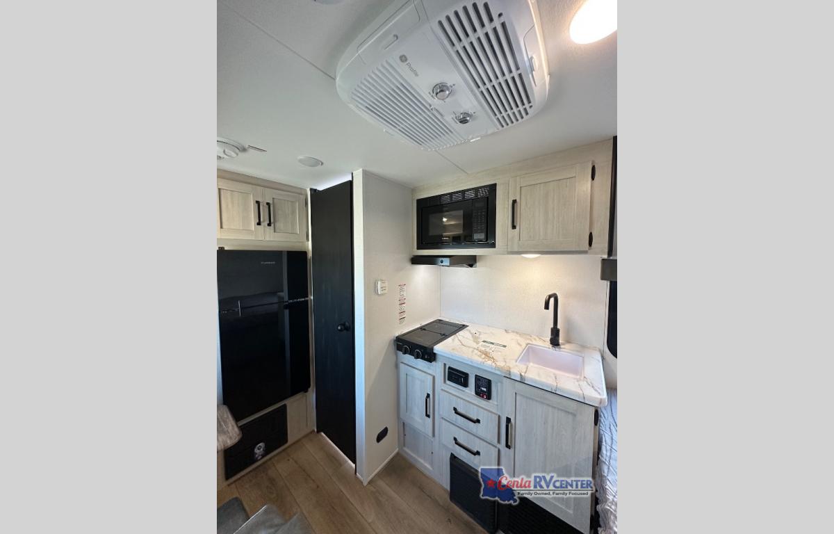 It will be so easy to enjoy camping trips in this single axle travel trailer! There is a front RV queen bed with flip-up storage at the foot of the bed for your belongings, and any additional guests can sleep on the booth dinette with an open shelf above. A full kitchen includes a stainless two burner cooktop and stainless microwave to cook meals each day, and the 4.3 cu. ft. 12V black glass refrigerator will keep your food fresh. And a private bath includes a 24" x 32" shower to clean off after a day outdoors!