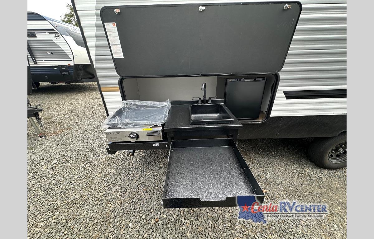 If you're looking for more space, this double axle, double slide out unit is perfect for your group of eight. Within the large slide in the living room, you'll find the booth dinette and sofa, which sit across from the optional TV if you want to enjoy movie nights. The full kitchen includes a stainless microwave and three burner cooktop to make meals, plus a pantry and 12V refrigerator for food storage. And an optional outside kitchen with a griddle can be added if you enjoy cooking outdoors! Your guests or littles are sure to enjoy the rear private bunkhouse that features a set of 38" x 76" bunks across from the third bunk and jiffy sofa within a slide out!