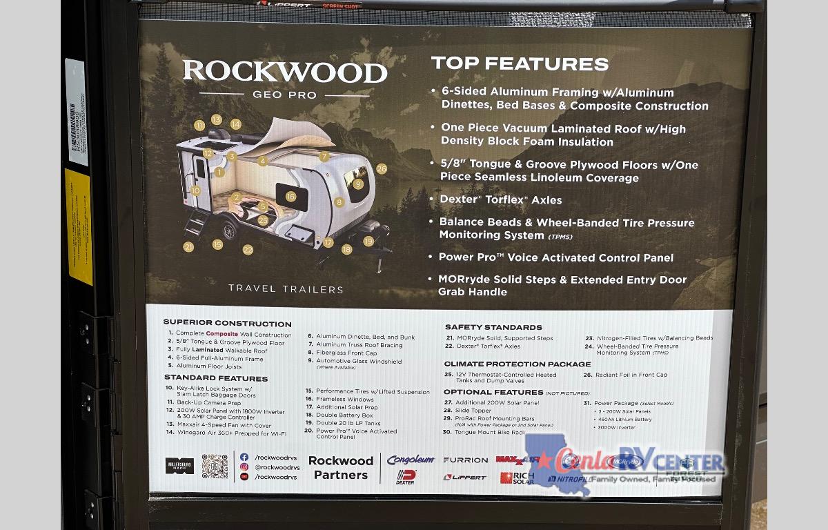 With any Rockwood GEO Pro travel trailer by Forest River you will enjoy easy towing, durable construction, and off-road capabilities with larger 15" tires and a lift kit! Each model is constructed with complete composite wall construction for added strength and durability, and the torsion axle, Rubber-Ryde suspension will make towing easier than ever. Inside, you'll find sleek roller shades for added privacy, a 12V refrigerator and a microwave, plus a 20,000 BTU furnace to keep you warm during the colder camping months.