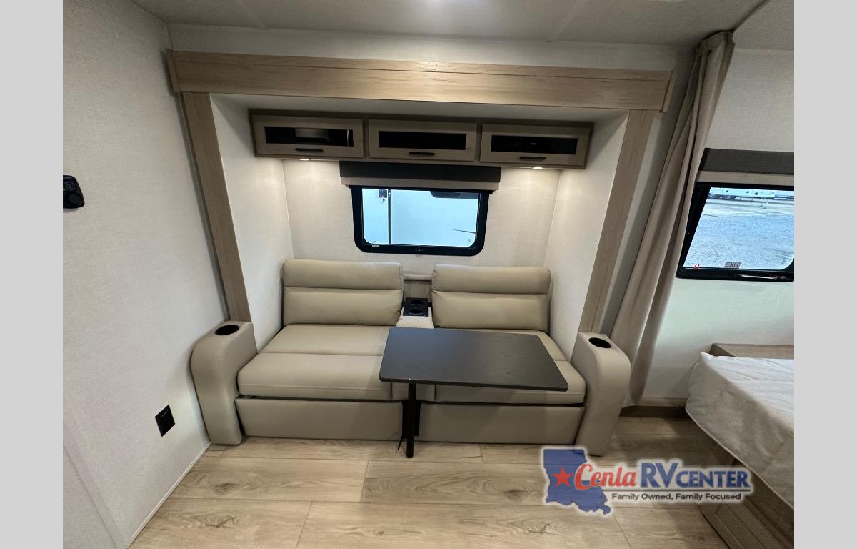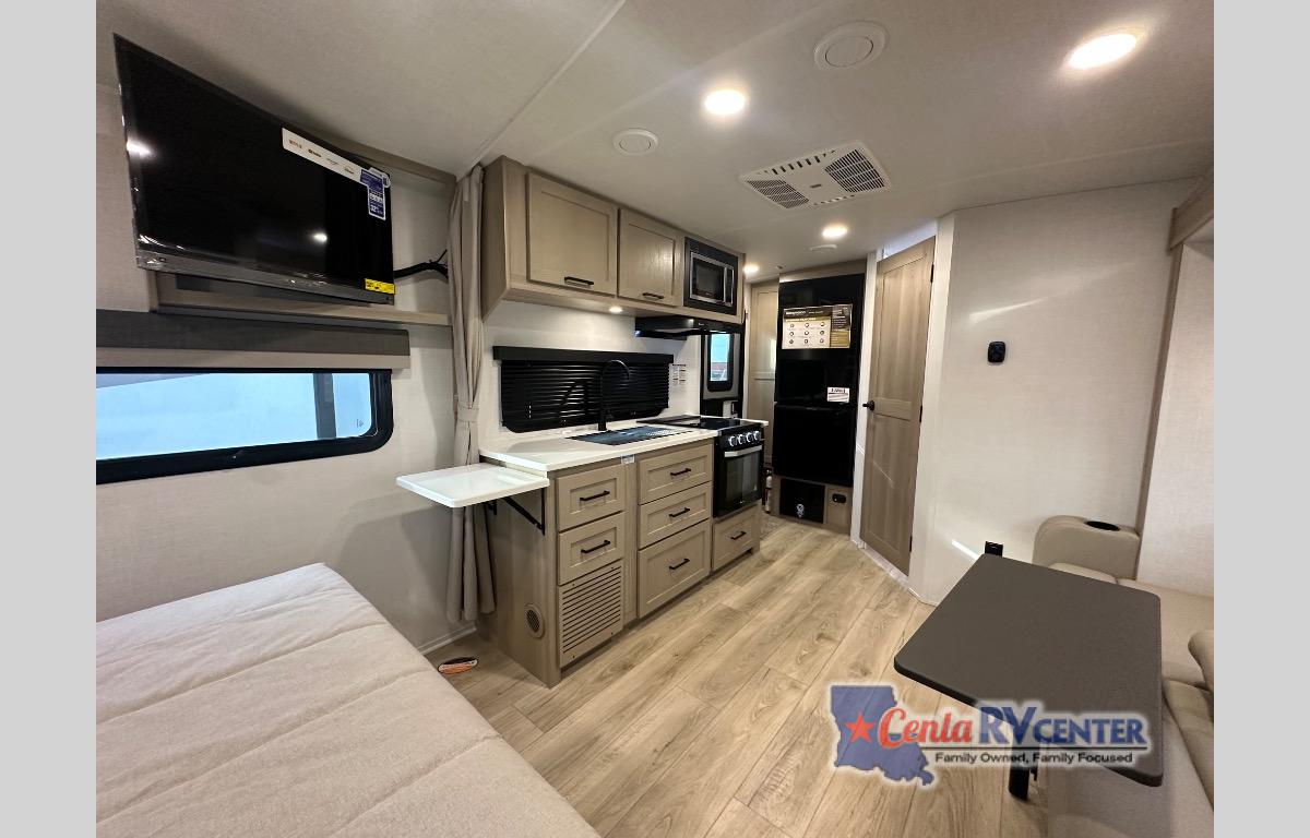 Wherever you decide to camp, you will love every minute in this cute couple's trailer. The sofa slide with a table will provide a place to relax, eat, and even sleep an extra guest if you have one, and the front RV queen bed includes a privacy curtain to enjoy your own space. There are dual bedroom wardrobes to keep your clothes tidy, and you'll find two pass-through storage compartments for your larger gear. . Since there is a full bath on board you won't have to use the camp's facilities, and you can make it a movie night with the 32" TV in the main living area!
