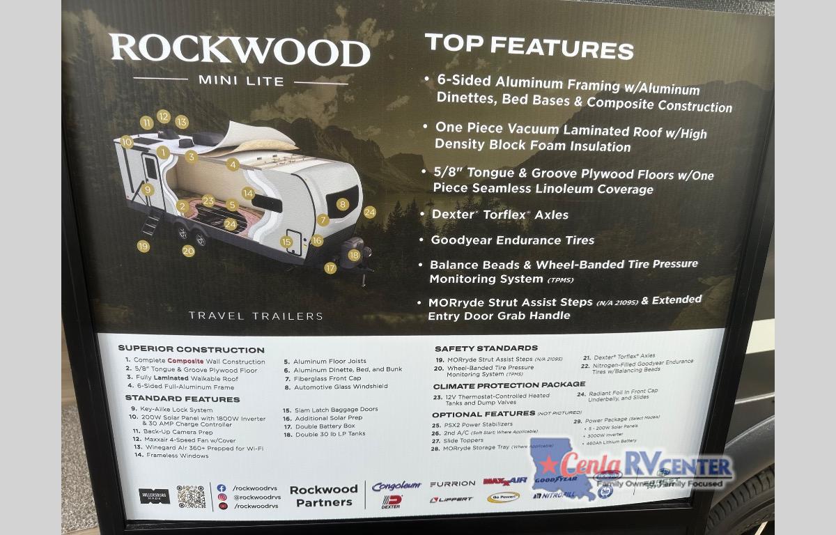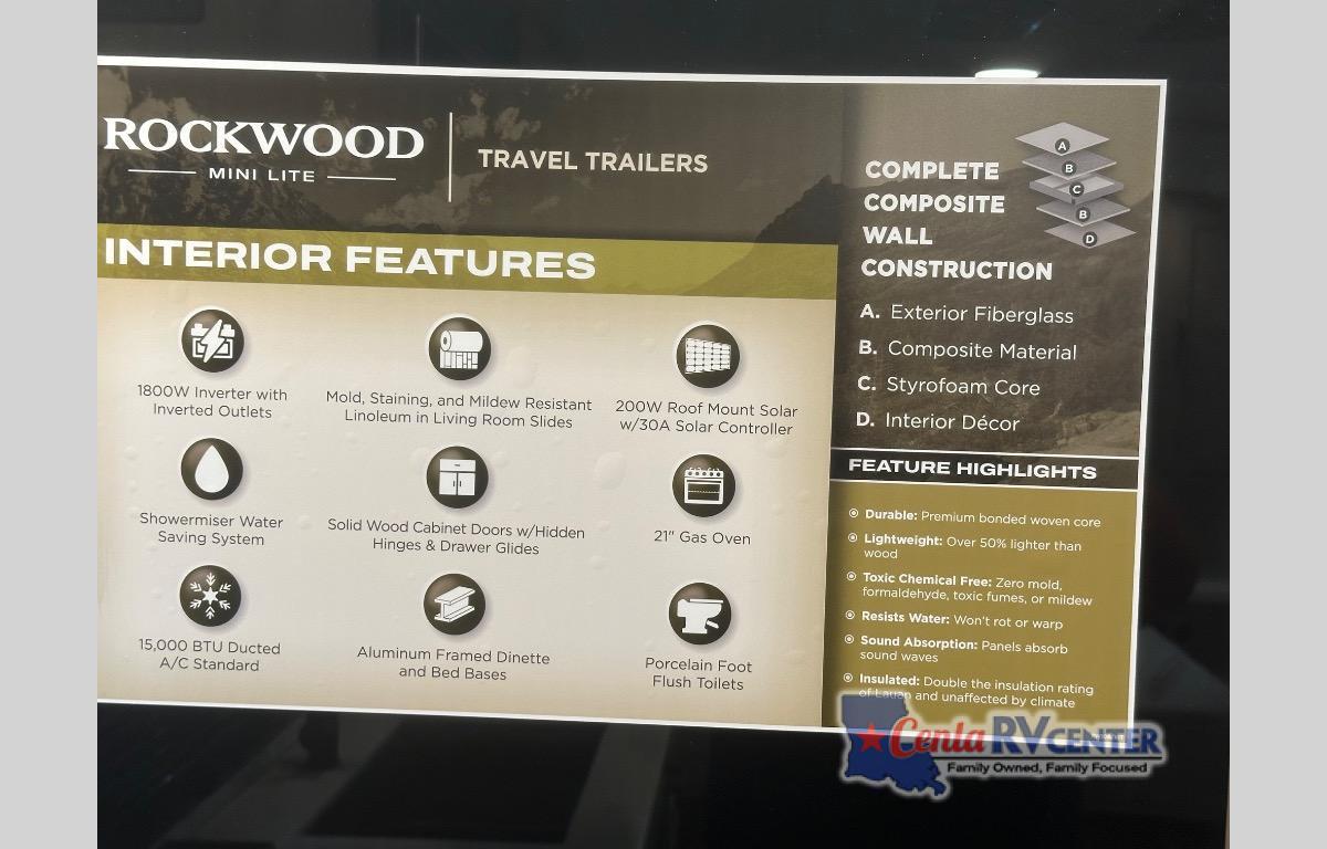 Each Rockwood Mini Lite travel trailer by Forest River is constructed with a fully laminated one-piece walkable roof, sleek frameless windows, and a six-sided full aluminum frame for strength and durability. The 12V thermostatically controlled heated tanks, plus radiant foil in the underbelly will allow you to camp well into the colder months, and the 200W roof solar panel will be perfect for a little off-gridding. Each model includes solid surface kitchen countertops, hidden hinge cabinet doors, roller shades, plus many more interior features. Having an AIR 360+ omnidirectional antenna with WiFi prep on board gives you the option to get some work done if it's needed, and the power tongue jack provides hassle-free set up, so you can enjoy more time relaxing!