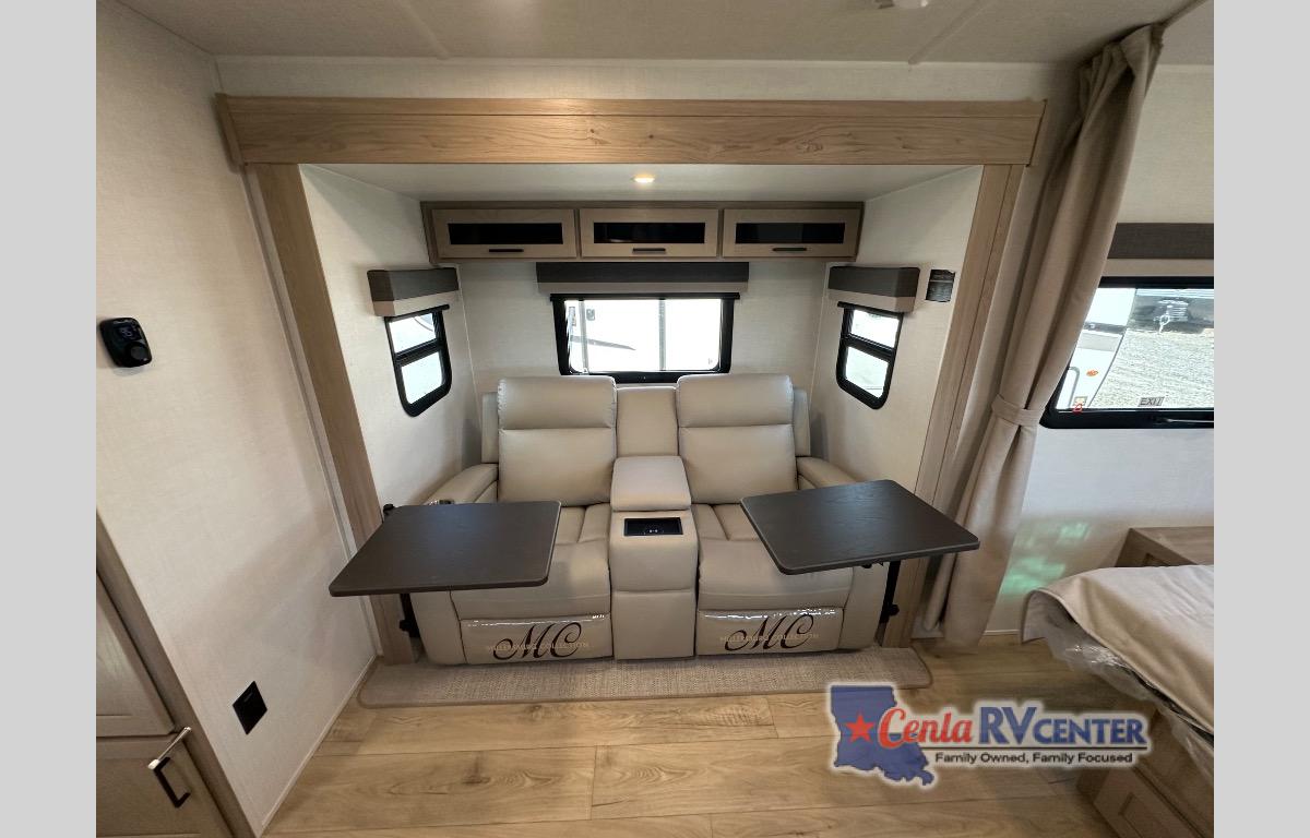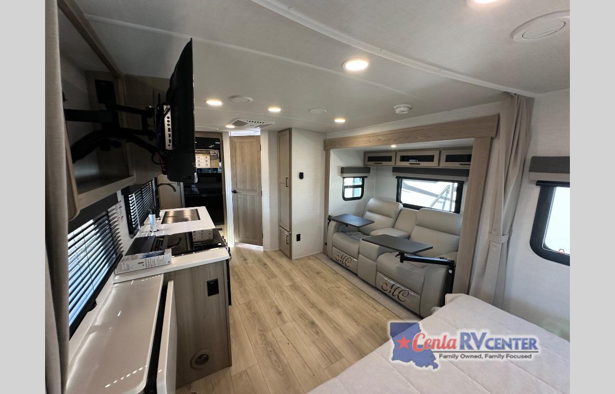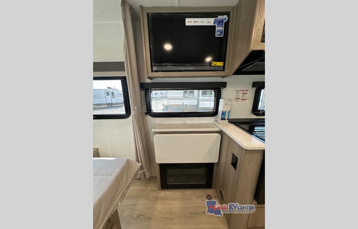 Enjoy the camping season with your spouse, friend, or significant other in this cozy travel trailer for two. Each morning, you can have your coffee on the 67" theater seats with a table within the slide out, then head outdoors to make pancakes on the outdoor griddle with an LP hookup. The interior kitchen includes a three burner cooktop, a microwave oven, plus a 12 volt refrigerator for perishables. An entertainment center with a fireplace will make your space feel more like home, and what's better than sleeping on your own queen bed with dual bedroom wardrobes for your clothes!?
