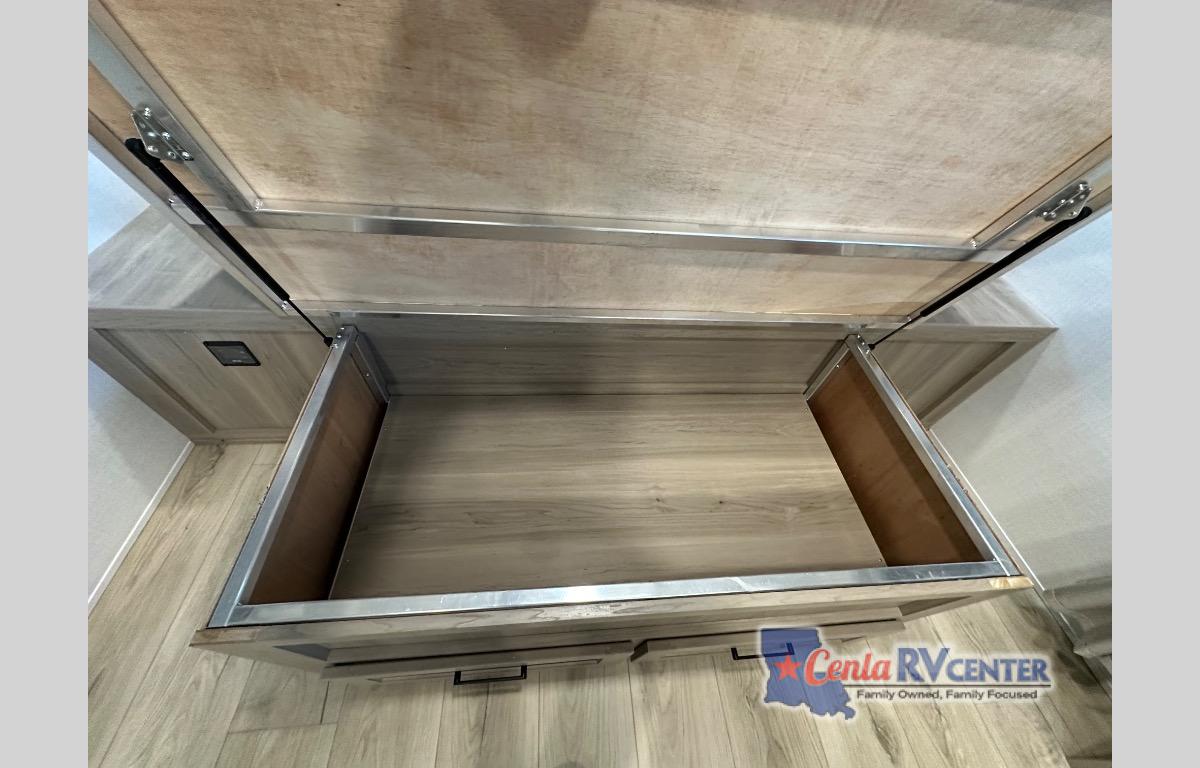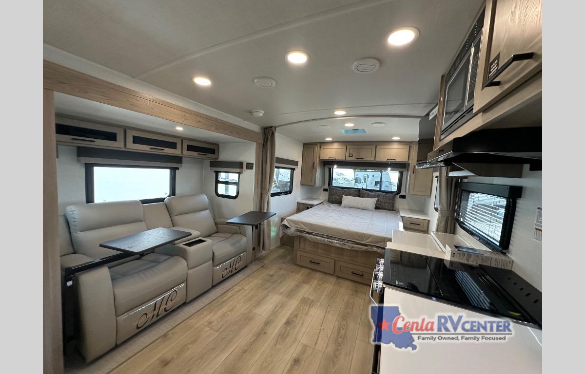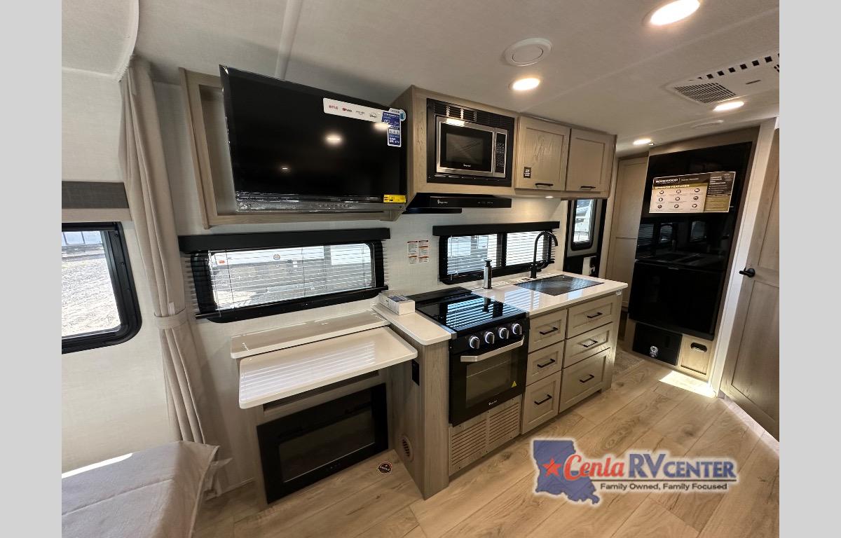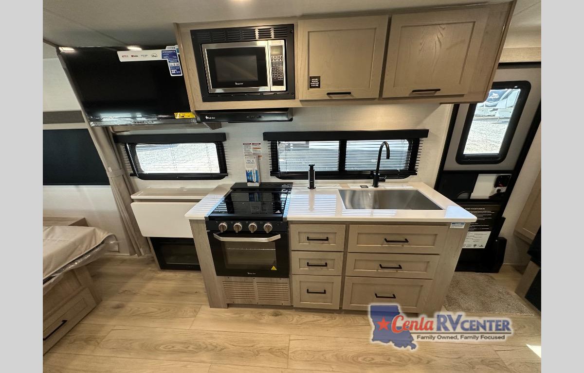 Enjoy the camping season with your spouse, friend, or significant other in this cozy travel trailer for two. Each morning, you can have your coffee on the 67" theater seats with a table within the slide out, then head outdoors to make pancakes on the outdoor griddle with an LP hookup. The interior kitchen includes a three burner cooktop, a microwave oven, plus a 12 volt refrigerator for perishables. An entertainment center with a fireplace will make your space feel more like home, and what's better than sleeping on your own queen bed with dual bedroom wardrobes for your clothes!?