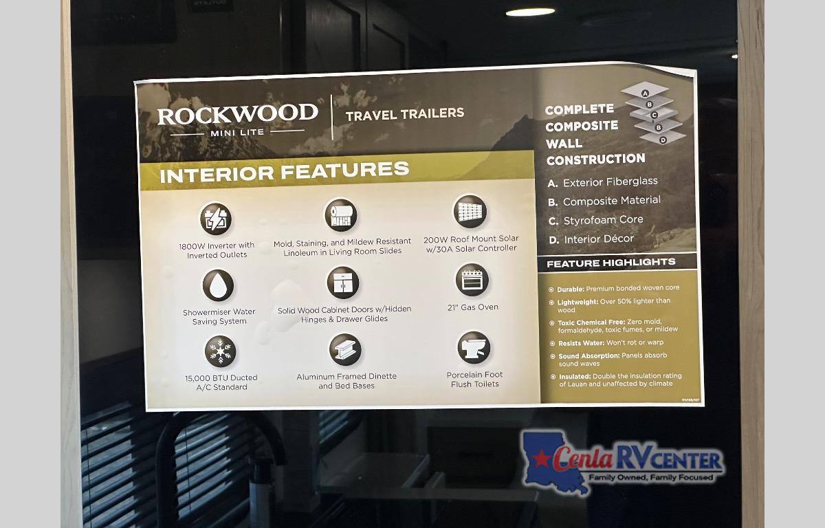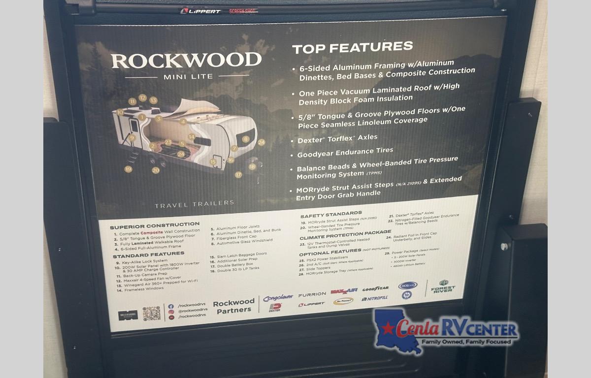 Each Rockwood Mini Lite travel trailer by Forest River is constructed with a fully laminated one-piece walkable roof, sleek frameless windows, and a six-sided full aluminum frame for strength and durability. The 12V thermostatically controlled heated tanks, plus radiant foil in the underbelly will allow you to camp well into the colder months, and the 200W roof solar panel will be perfect for a little off-gridding. Each model includes solid surface kitchen countertops, hidden hinge cabinet doors, roller shades, plus many more interior features. Having an AIR 360+ omnidirectional antenna with WiFi prep on board gives you the option to get some work done if it's needed, and the power tongue jack provides hassle-free set up, so you can enjoy more time relaxing!