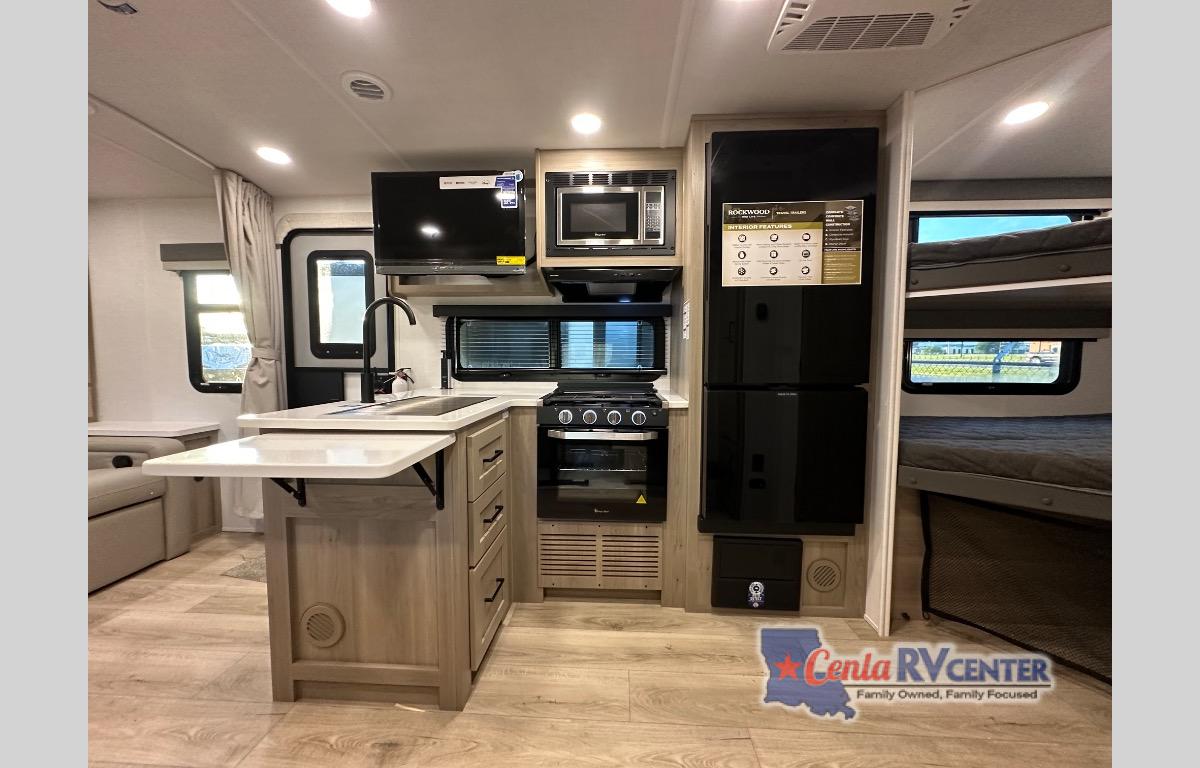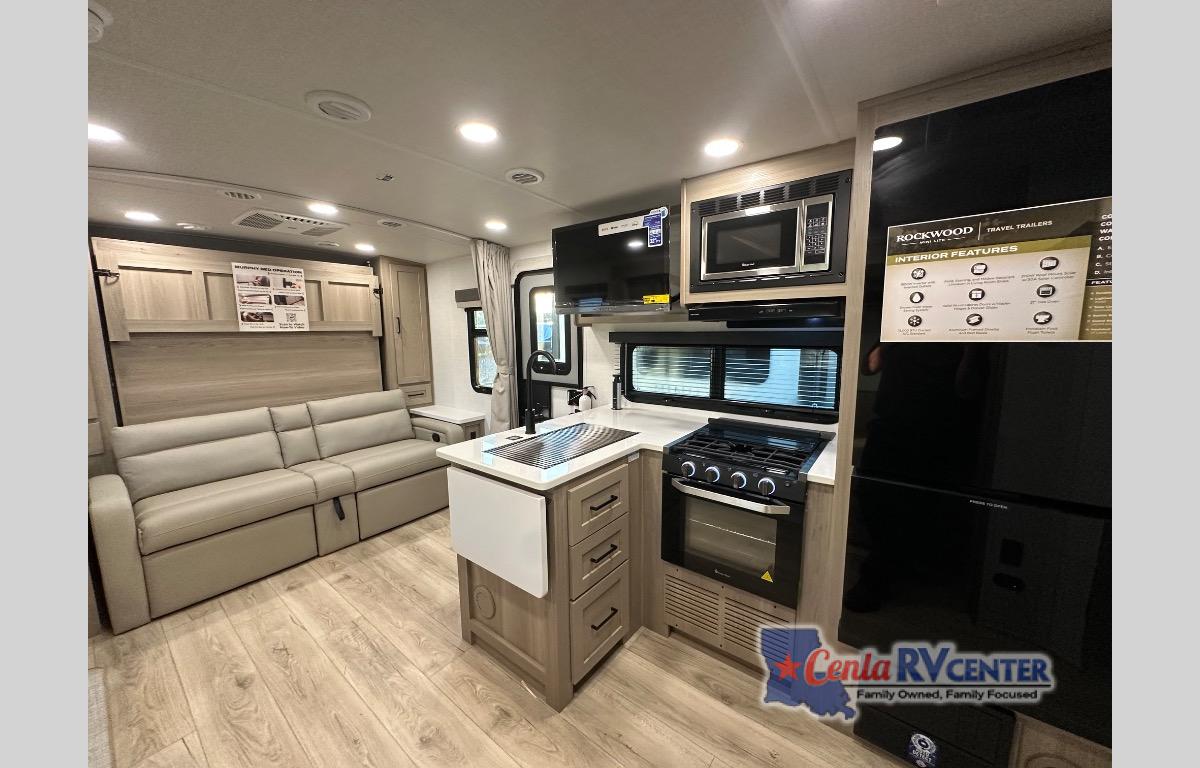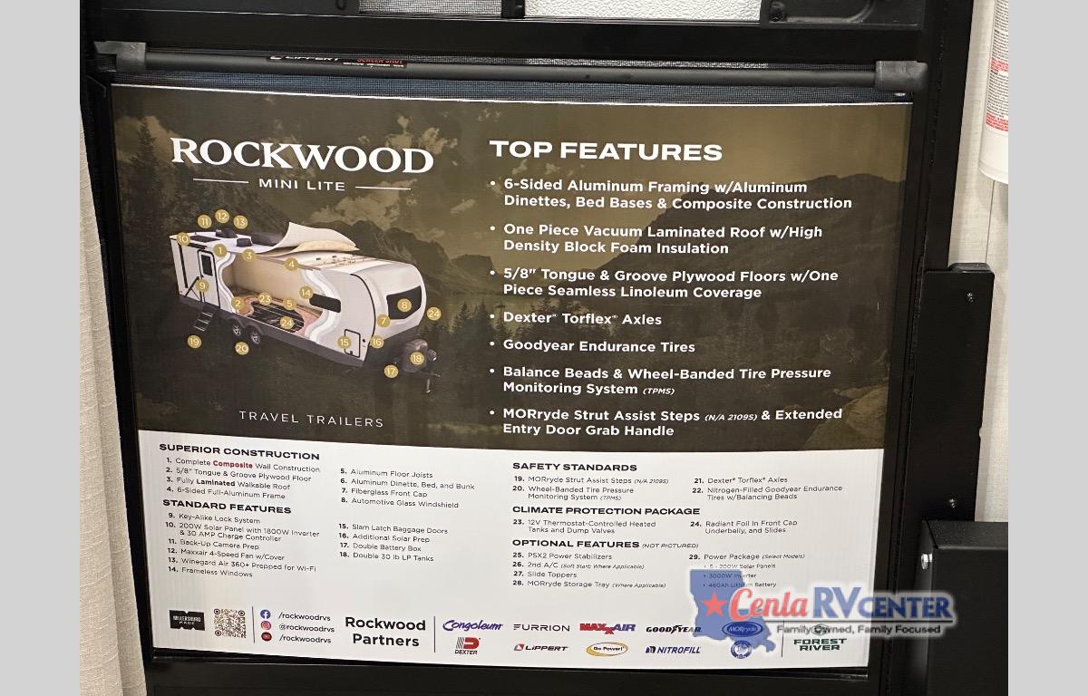 Each Rockwood Mini Lite travel trailer by Forest River is constructed with a fully laminated one-piece walkable roof, sleek frameless windows, and a six-sided full aluminum frame for strength and durability. The 12V thermostatically controlled heated tanks, plus radiant foil in the underbelly will allow you to camp well into the colder months, and the 200W roof solar panel will be perfect for a little off-gridding. Each model includes solid surface kitchen countertops, hidden hinge cabinet doors, roller shades, plus many more interior features. Having an AIR 360+ omnidirectional antenna with WiFi prep on board gives you the option to get some work done if it's needed, and the power tongue jack provides hassle-free set up, so you can enjoy more time relaxing!