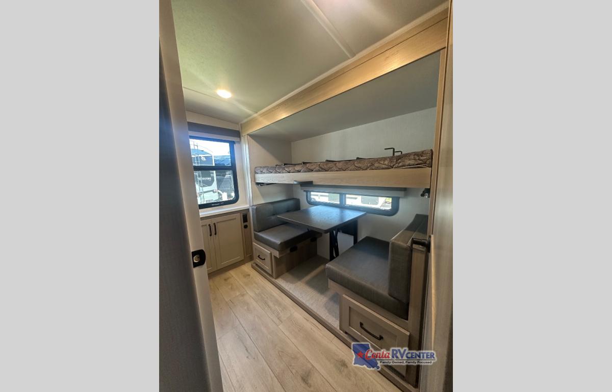 This trailer is one the whole crew will love! Start unloading the pass-thru storage when you arrive at your campsite, then put out the 18' power awning and start lunch on the exterior griddle. There is a full bath inside when you need to freshen up, and the fully-equipped interior kitchen can be used if the weather isn't cooperating with your plans. A U-shaped dinette slide provides a place to dine together and play board games, and two guests can sleep here at night. Speaking of nighttime, there is also a private bunkhouse in the back with a Dream Dinette and flip-up bunk plus a slide out for more space and an optional TV. You'll find your own space up front on the RV queen Murphy bed, complete with dual wardrobes and a privacy curtain when you need to get dressed. And in the morning you can fold away the bed to relax on the 74" sofa!