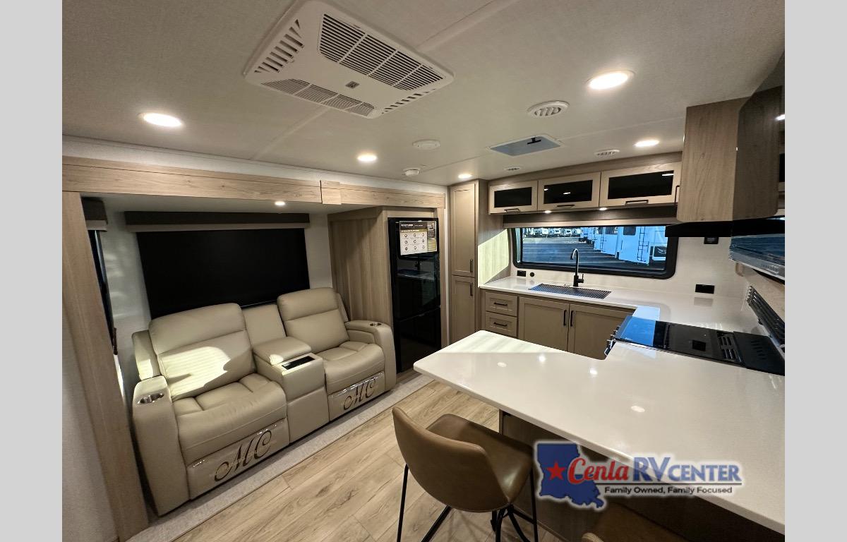 This travel trailer is the best option for you and your partner! The lavish full rear bathroom features a spacious layout and a convenient linen closet, perfect for relaxation and refreshment. The elegant bedroom boasts a plush queen bed, ample wardrobe space, and stylish dresser, creating a serene retreat. The spacious living room and kitchen combined area is the heart of the trailer, featuring plush theater seating for cozy movie nights, a generous closet for storing essentials, and a 12V Smart TV for entertainment on the go. Plus, the expansive countertop with chairs provides a perfect spot for gourmet meals or socializing, while the premium three-burner cooktop, well-stocked kitchen pantry, and high-performance microwave make meal prep and cooking a true delight.