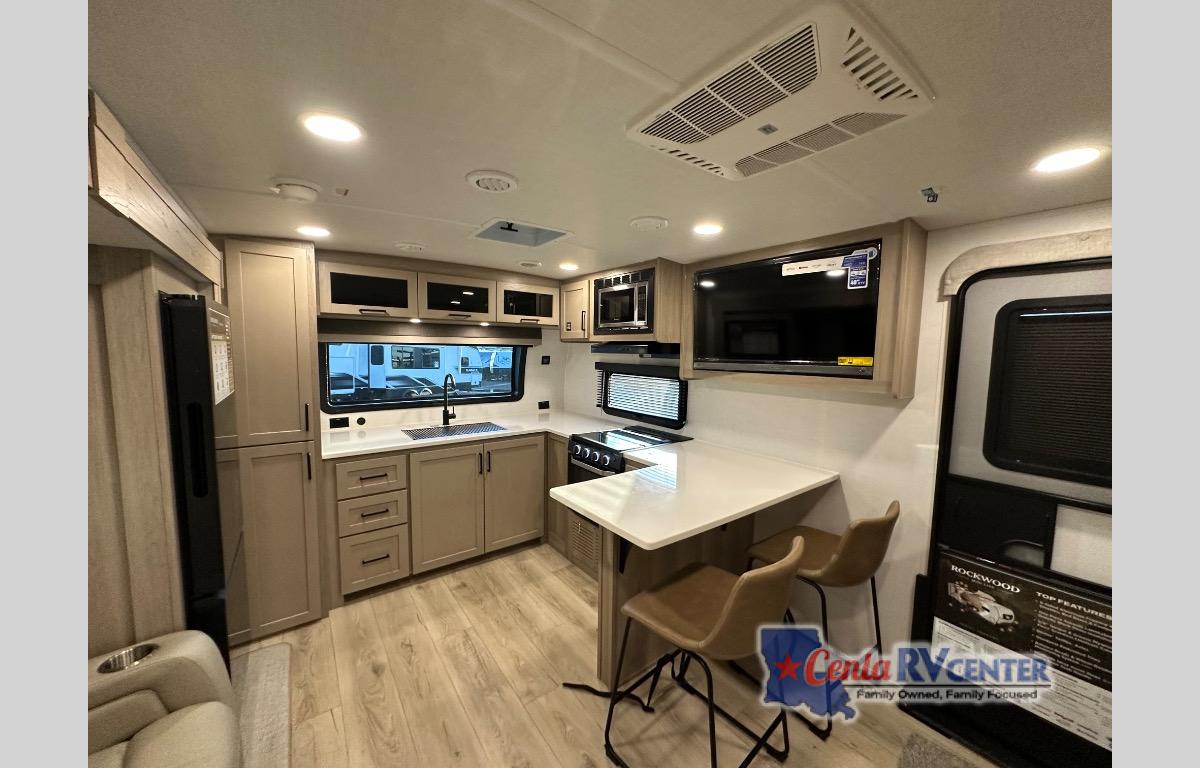 Each Rockwood Mini Lite travel trailer by Forest River is constructed with a fully laminated one-piece walkable roof, sleek frameless windows, and a six-sided full aluminum frame for strength and durability. The 12V thermostatically controlled heated tanks, plus radiant foil in the underbelly will allow you to camp well into the colder months, and the 200W roof solar panel will be perfect for a little off-gridding. Each model includes solid surface kitchen countertops, hidden hinge cabinet doors, roller shades, plus many more interior features. Having an AIR 360+ omnidirectional antenna with WiFi prep on board gives you the option to get some work done if it's needed, and the power tongue jack provides hassle-free set up, so you can enjoy more time relaxing!