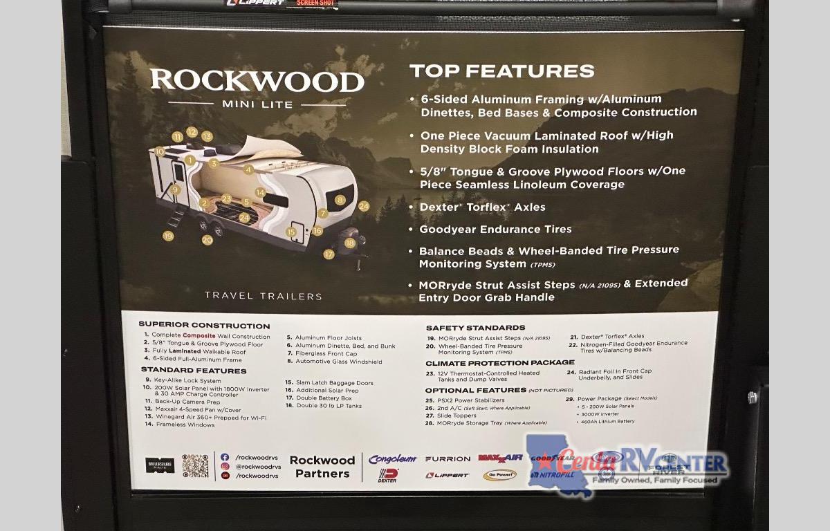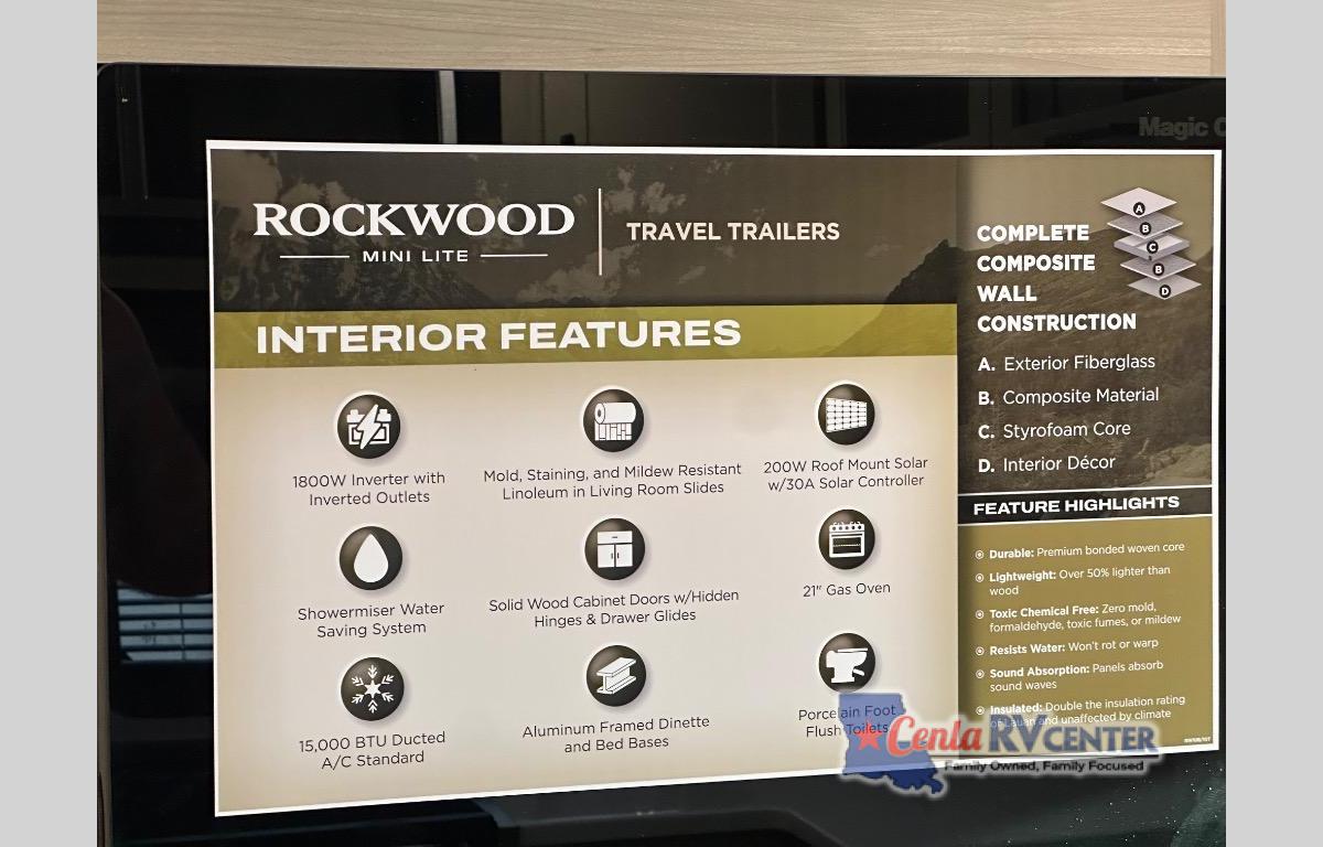 Each Rockwood Mini Lite travel trailer by Forest River is constructed with a fully laminated one-piece walkable roof, sleek frameless windows, and a six-sided full aluminum frame for strength and durability. The 12V thermostatically controlled heated tanks, plus radiant foil in the underbelly will allow you to camp well into the colder months, and the 200W roof solar panel will be perfect for a little off-gridding. Each model includes solid surface kitchen countertops, hidden hinge cabinet doors, roller shades, plus many more interior features. Having an AIR 360+ omnidirectional antenna with WiFi prep on board gives you the option to get some work done if it's needed, and the power tongue jack provides hassle-free set up, so you can enjoy more time relaxing!
