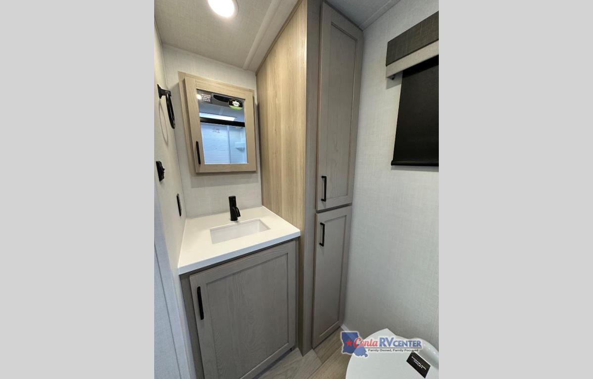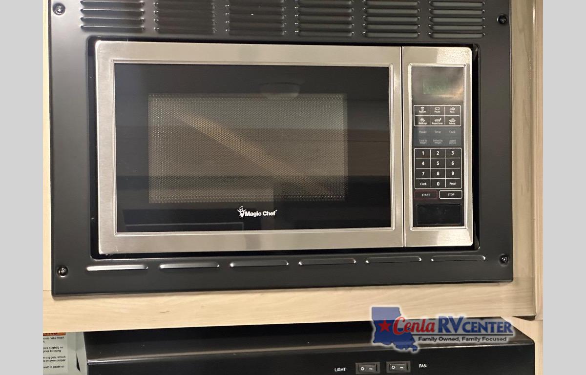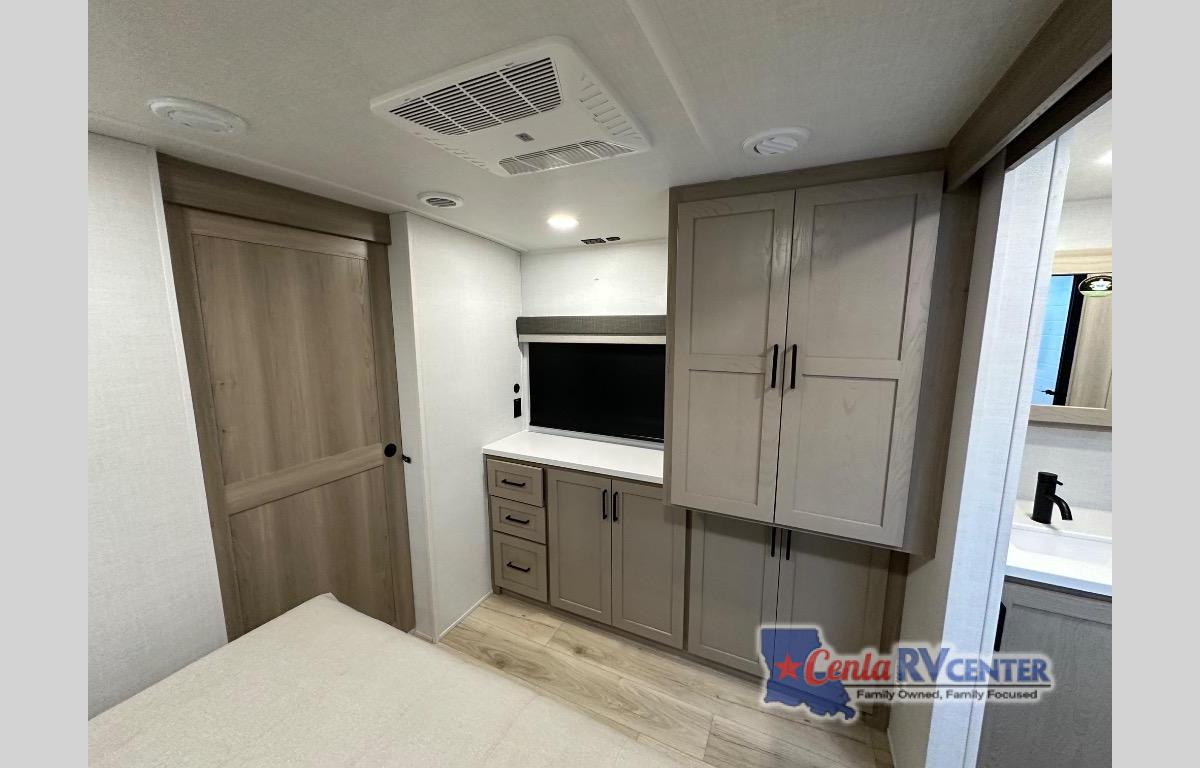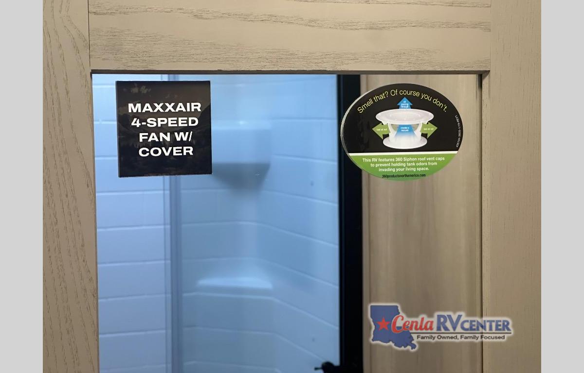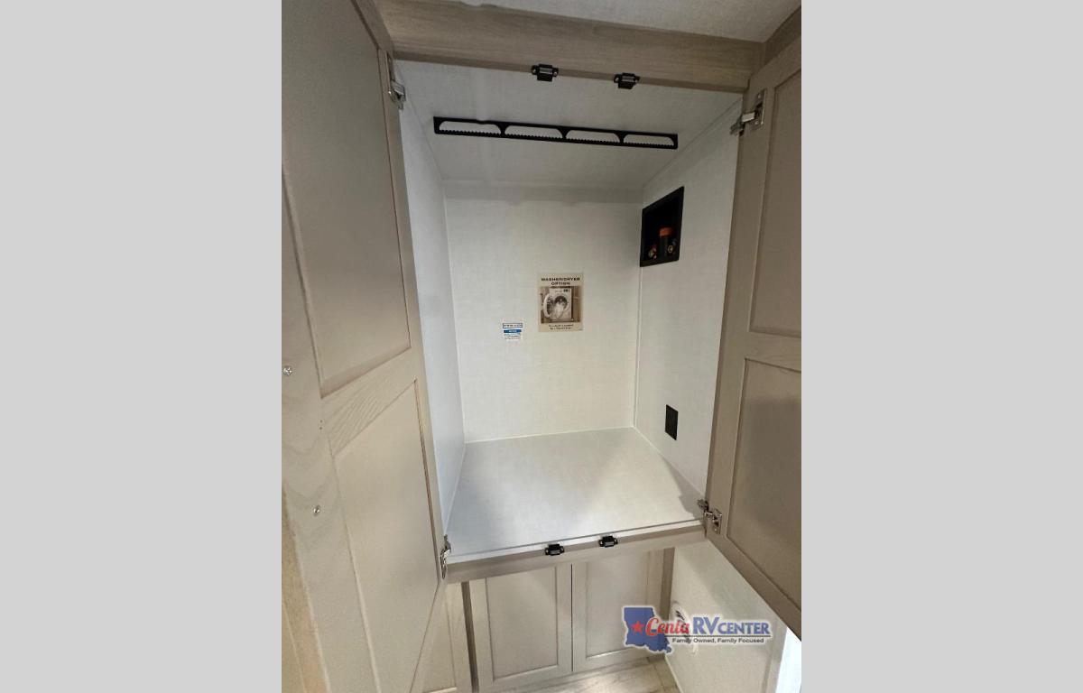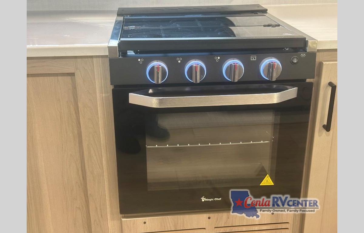 This travel trailer is the best option for you and your partner! The lavish full rear bathroom features a spacious layout and a convenient linen closet, perfect for relaxation and refreshment. The elegant bedroom boasts a plush queen bed, ample wardrobe space, and stylish dresser, creating a serene retreat. The spacious living room and kitchen combined area is the heart of the trailer, featuring plush theater seating for cozy movie nights, a generous closet for storing essentials, and a 12V Smart TV for entertainment on the go. Plus, the expansive countertop with chairs provides a perfect spot for gourmet meals or socializing, while the premium three-burner cooktop, kitchen pantry, and microwave make meal prep and cooking a true delight.