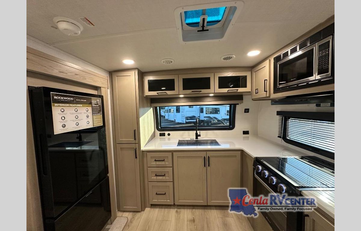 Each Rockwood Mini Lite travel trailer by Forest River is constructed with a fully laminated one-piece walkable roof, sleek frameless windows, and a six-sided full aluminum frame for strength and durability. The 12V thermostatically controlled heated tanks, plus radiant foil in the underbelly will allow you to camp well into the colder months, and the 200W roof solar panel will be perfect for a little off-gridding. Each model includes solid surface kitchen countertops, hidden hinge cabinet doors, roller shades, plus many more interior features. Having an AIR 360+ omnidirectional antenna with WiFi prep on board gives you the option to get some work done if it's needed, and the power tongue jack provides hassle-free set up, so you can enjoy more time relaxing!