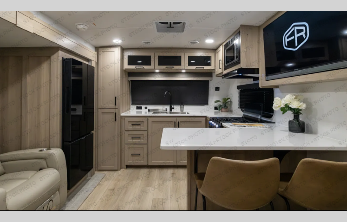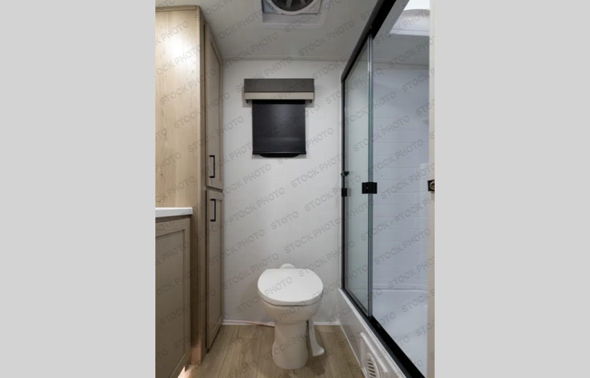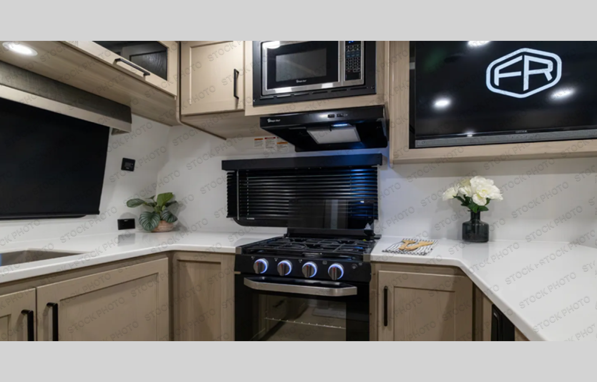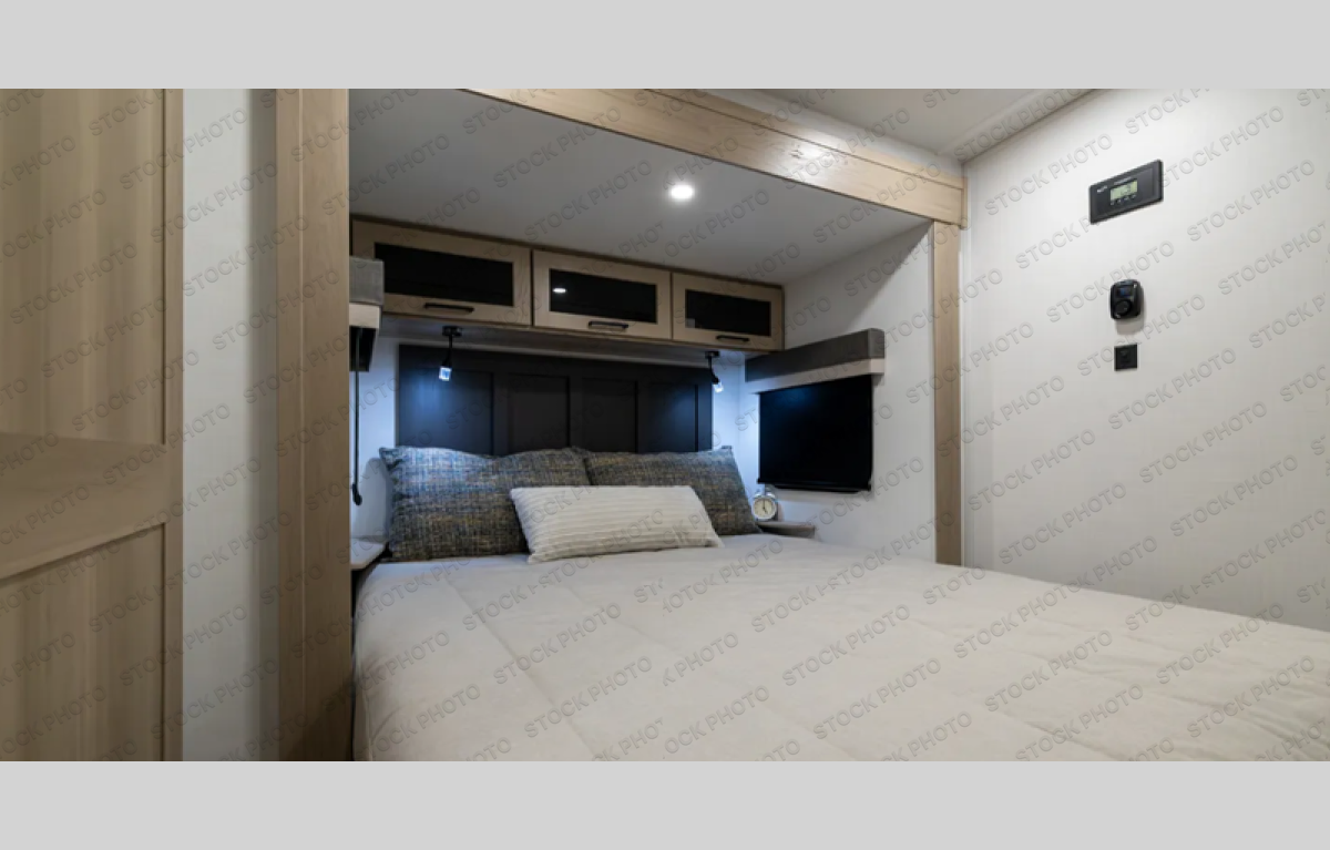 This travel trailer is the best option for you and your partner! The lavish full rear bathroom features a spacious layout and a convenient linen closet, perfect for relaxation and refreshment. The elegant bedroom boasts a plush queen bed, ample wardrobe space, and stylish dresser, creating a serene retreat. The spacious living room and kitchen combined area is the heart of the trailer, featuring plush theater seating for cozy movie nights, a generous closet for storing essentials, and a 12V Smart TV for entertainment on the go. Plus, the expansive countertop with chairs provides a perfect spot for gourmet meals or socializing, while the premium three-burner cooktop, kitchen pantry, and microwave make meal prep and cooking a true delight.