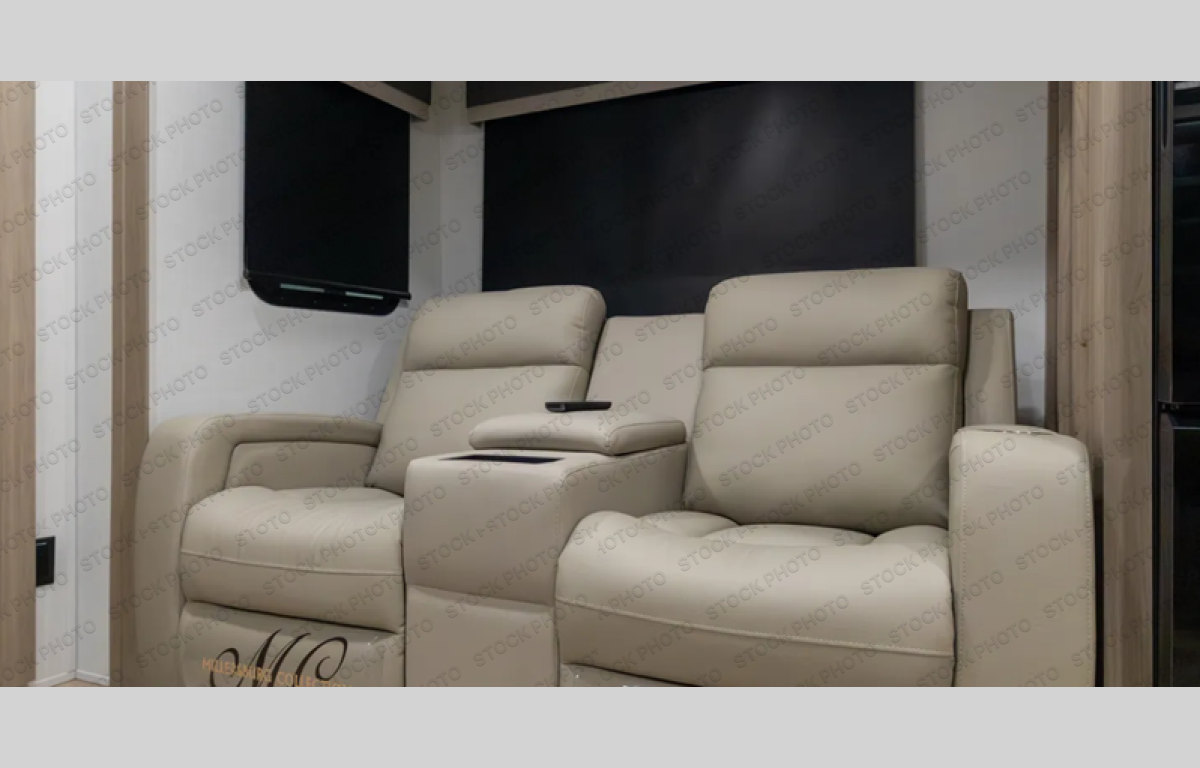 Queen bed * Theater seating * Countertop with chairs * 200W roof solar panel * 12V thermostatically controlled heated tanks