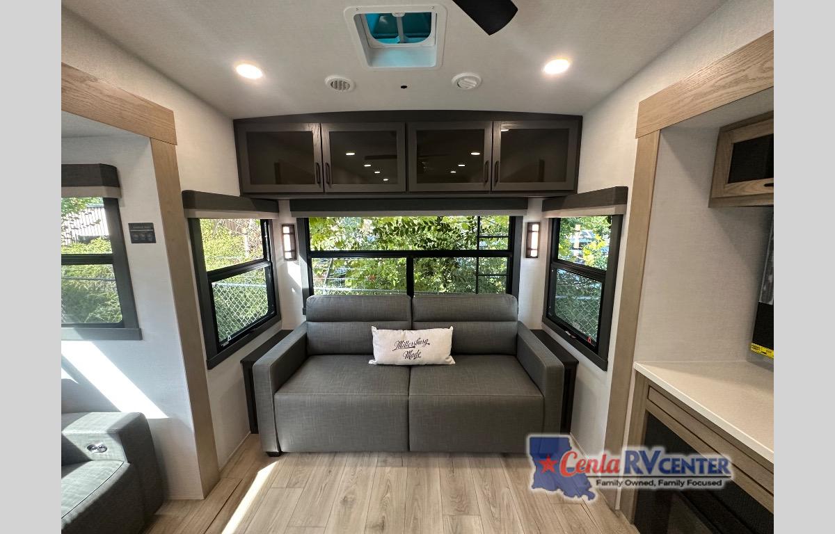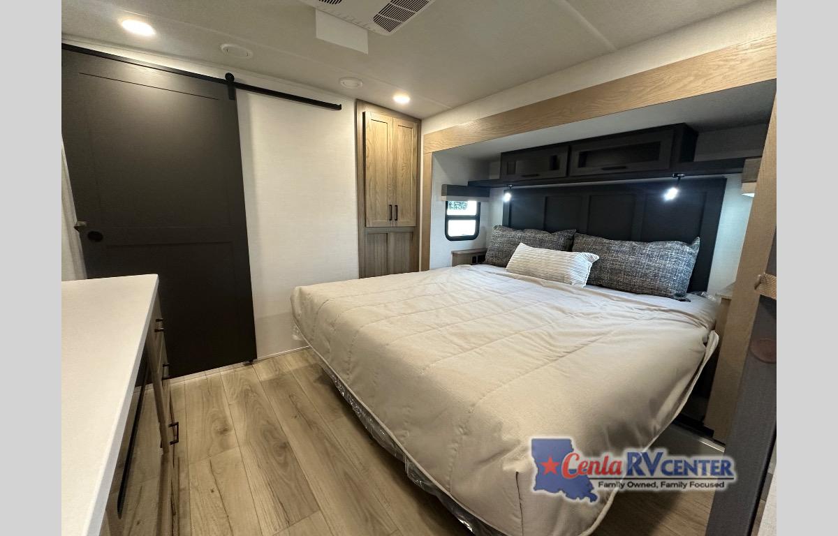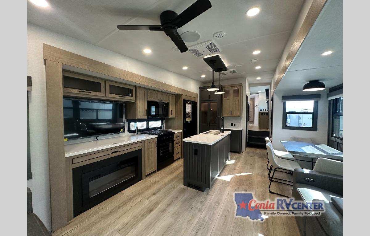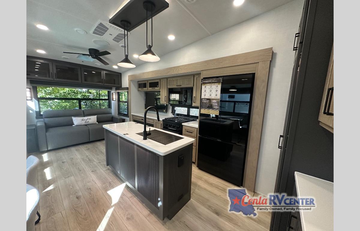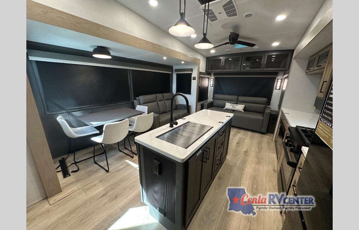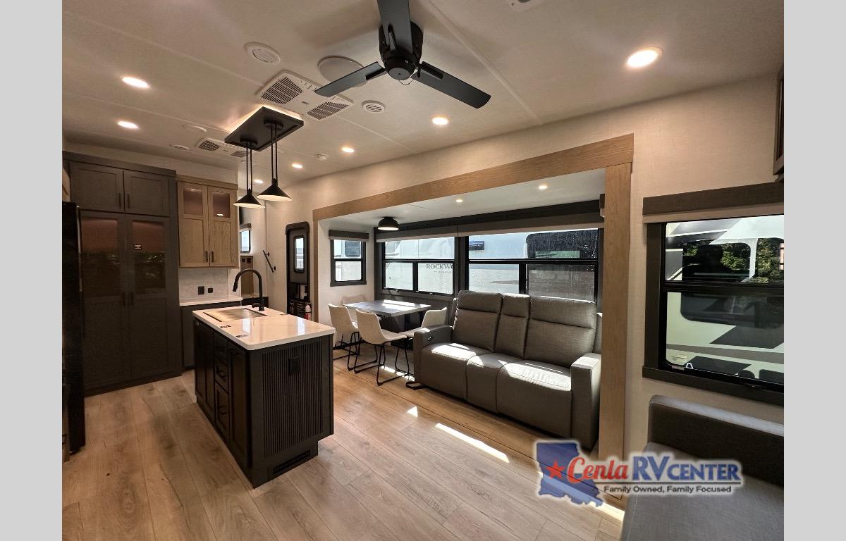 This well-designed layout offers both comfort and functionality. The 72" x 80" king bed provides a spacious and restful sleeping area in the main bedroom. Just steps away, the full front bathroom includes a shower seat for added accessibility, while a convenient half bath near the entrance is perfect for quick use. The kitchen features solid surface countertops and a large island, giving the cook plenty of room to move and work comfortably, along with a rotating table and chairs for dinner and board games. A pull-out desk creates a dedicated space for working away from home, and the 76" hide-a-bed adds extra sleeping space for the whole gang.