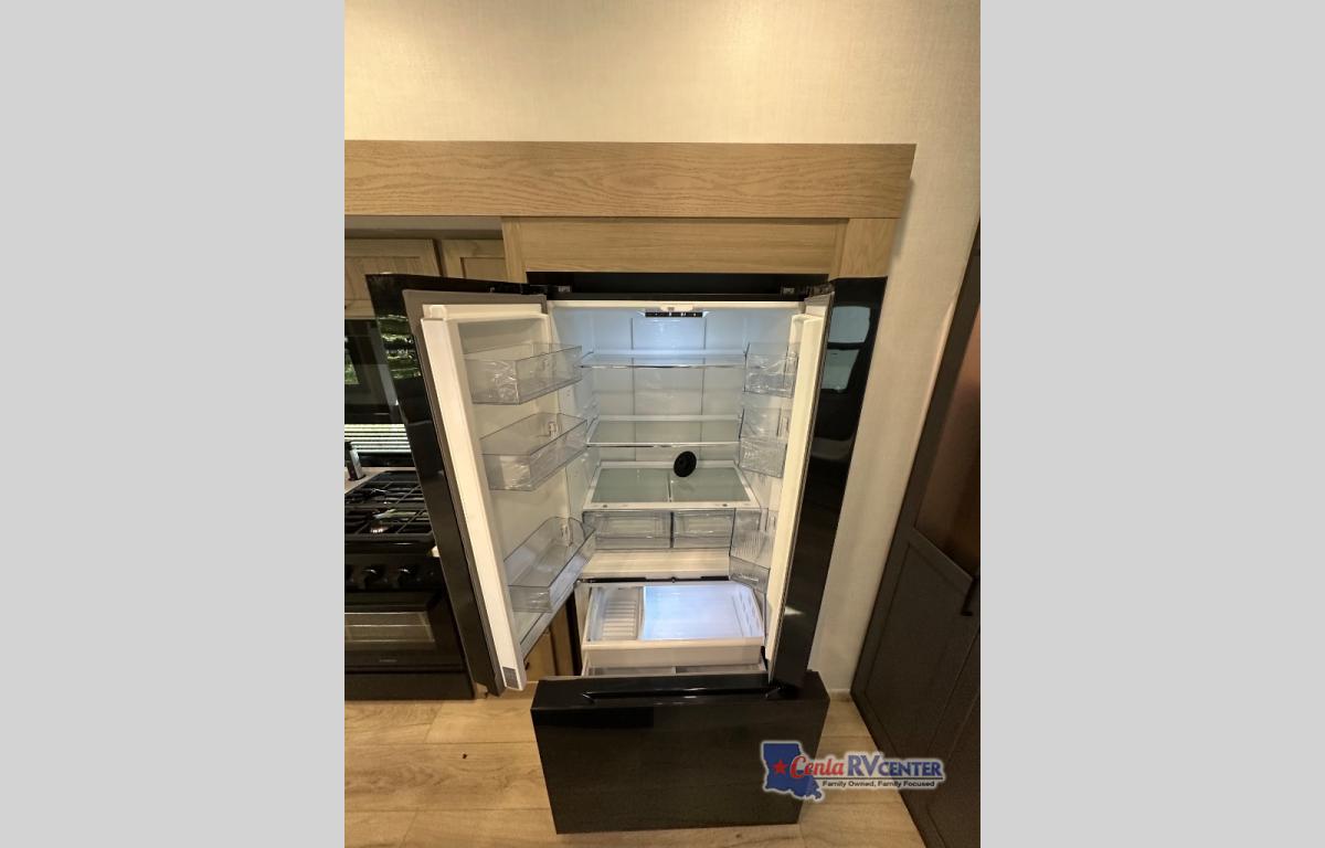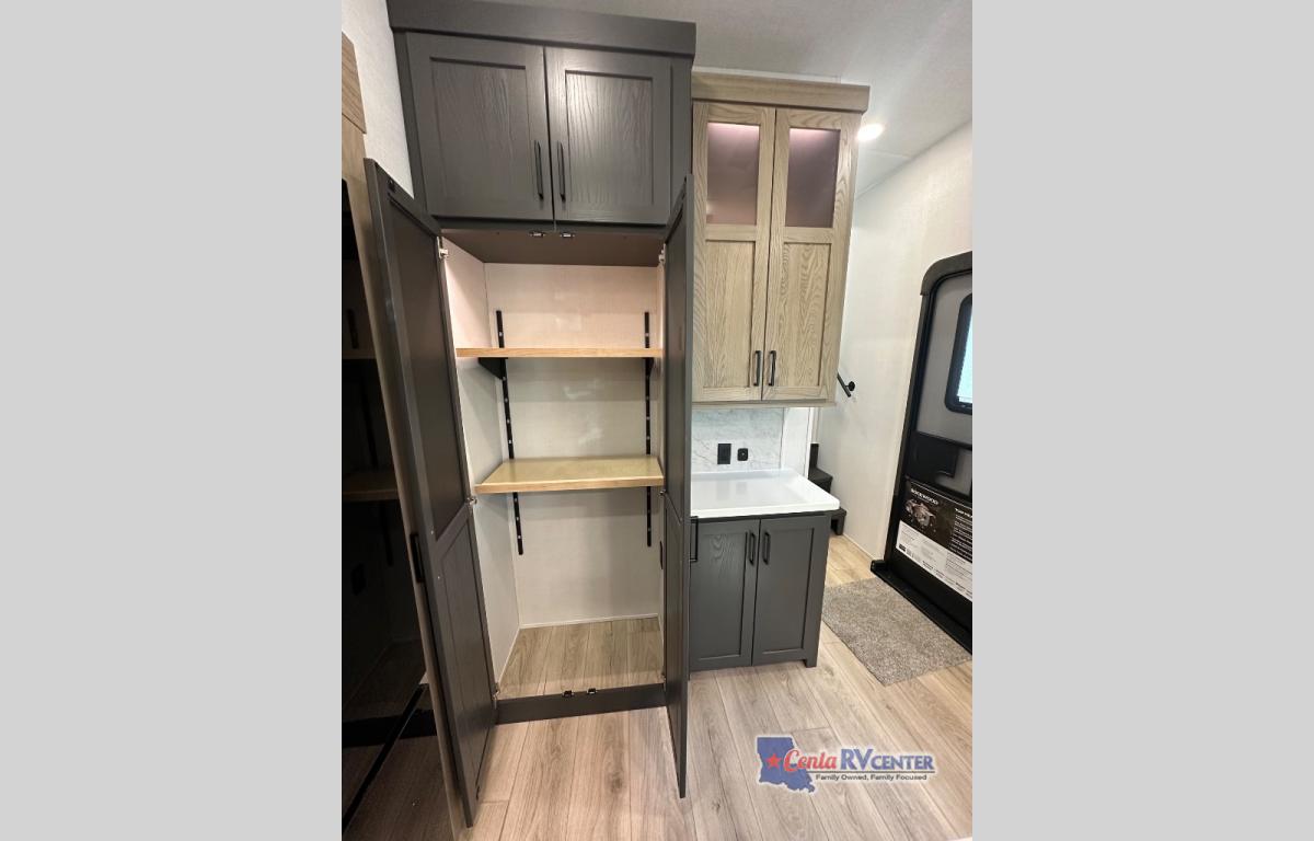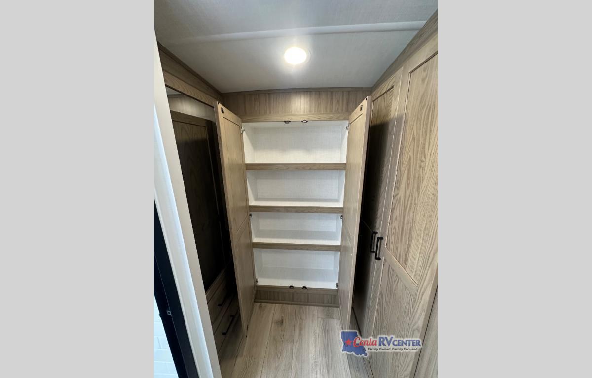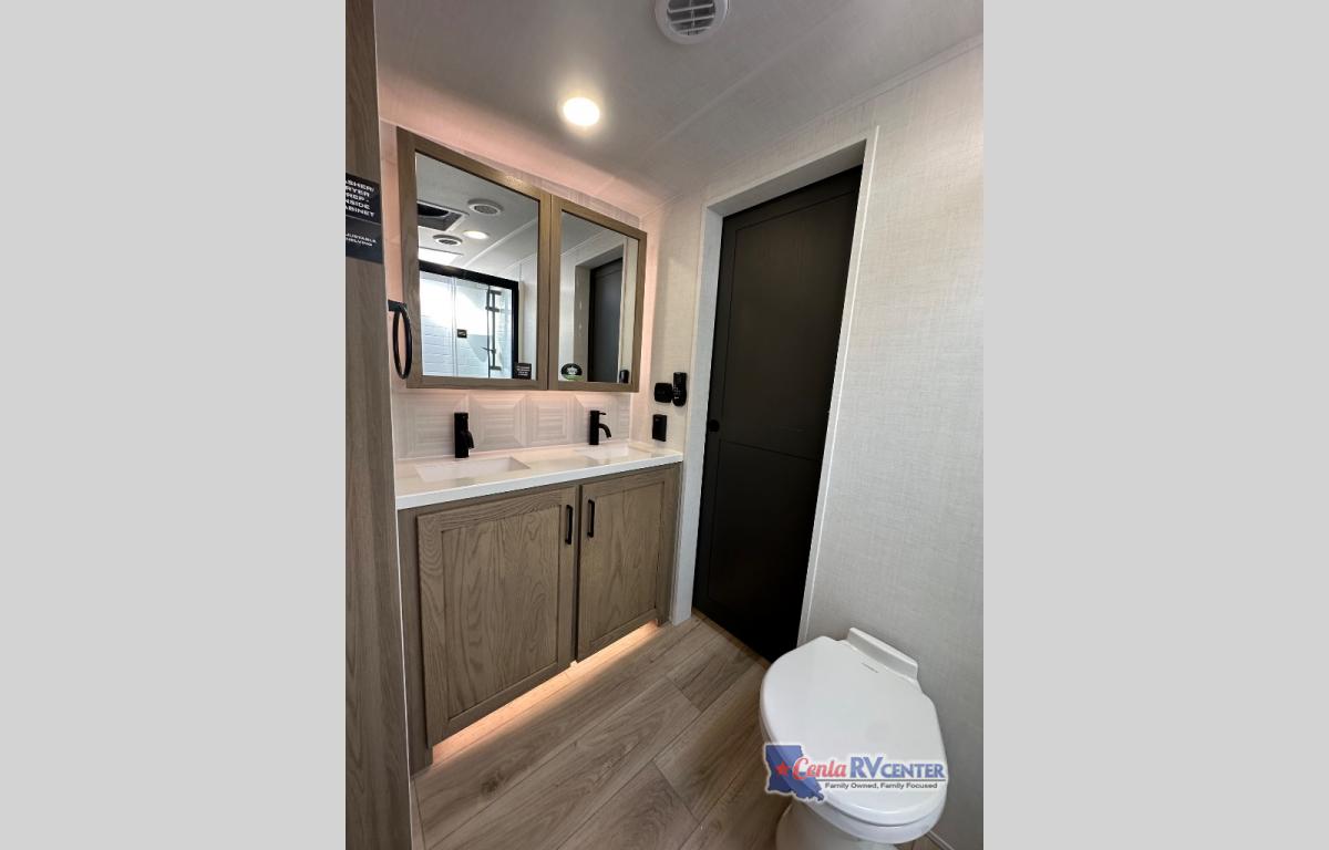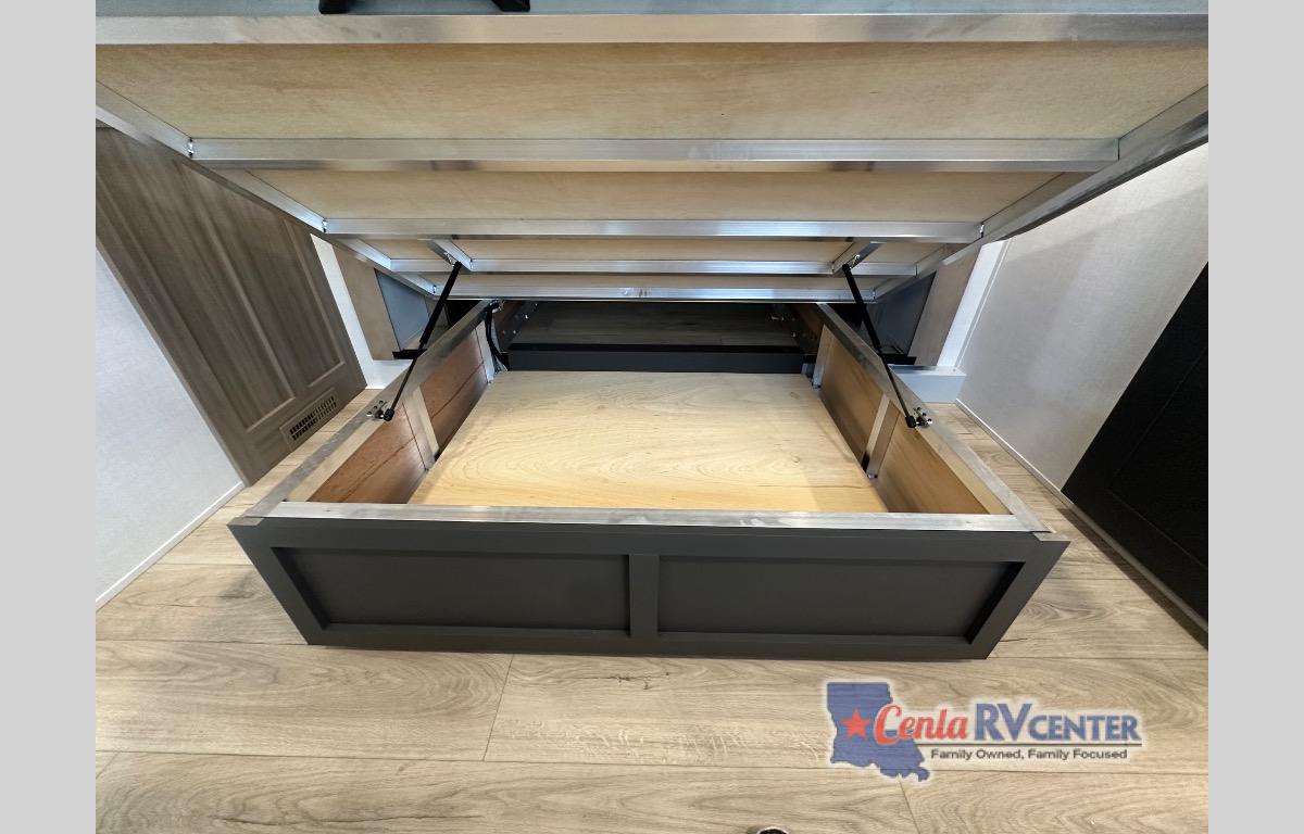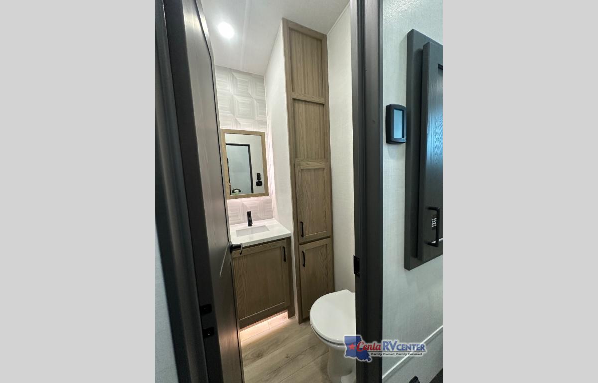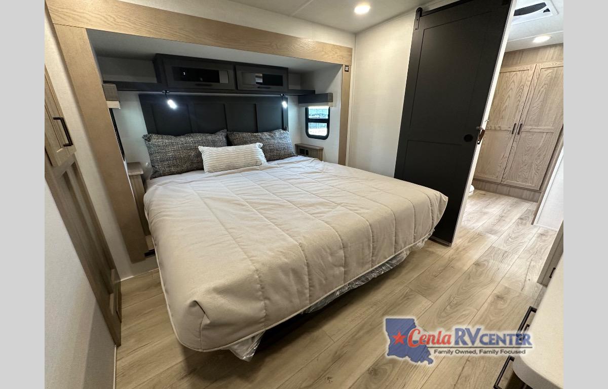 This well-designed layout offers both comfort and functionality. The 72" x 80" king bed provides a spacious and restful sleeping area in the main bedroom. Just steps away, the full front bathroom includes a shower seat for added accessibility, while a convenient half bath near the entrance is perfect for quick use. The kitchen features solid surface countertops and a large island, giving the cook plenty of room to move and work comfortably, along with a rotating table and chairs for dinner and board games. A pull-out desk creates a dedicated space for working away from home, and the 76" hide-a-bed adds extra sleeping space for the whole gang.