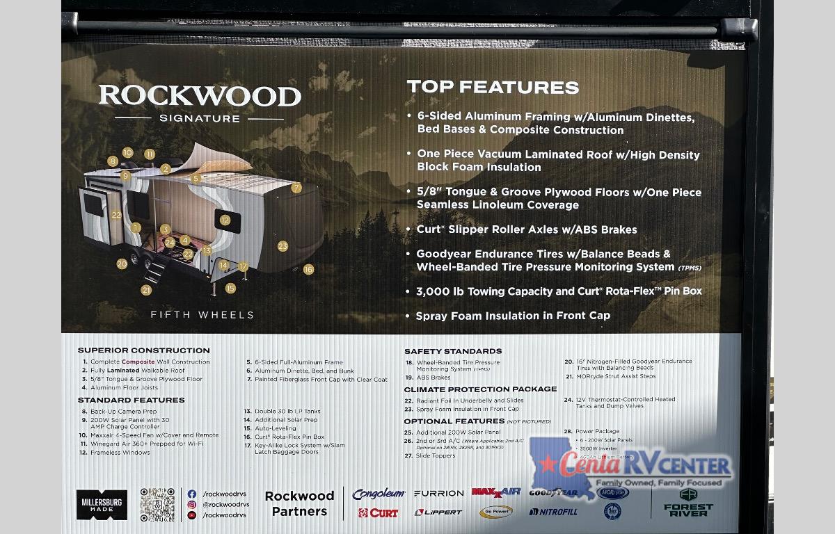With any Rockwood Signature fifth wheel or travel trailer by Forest River RV, you will enjoy superior construction that includes a fully laminated walkable roof, 6-sided full-aluminum frame, and a painted fiberglass front cap with Clear Coat for added durability. Outside, you'll find a 200W solar panel for off-grid capabilities, slam baggage doors, and Key-Alike lock system for added convenience. Head inside to find soft close roller bearing drawers, roller shades, and residential style gas range. These travel trailer and fifth wheels also feature Goodyear Endurance tires with a tire pressure monitoring system plus Dexter Torflex torsion axles for smooth towing!