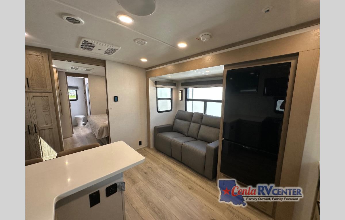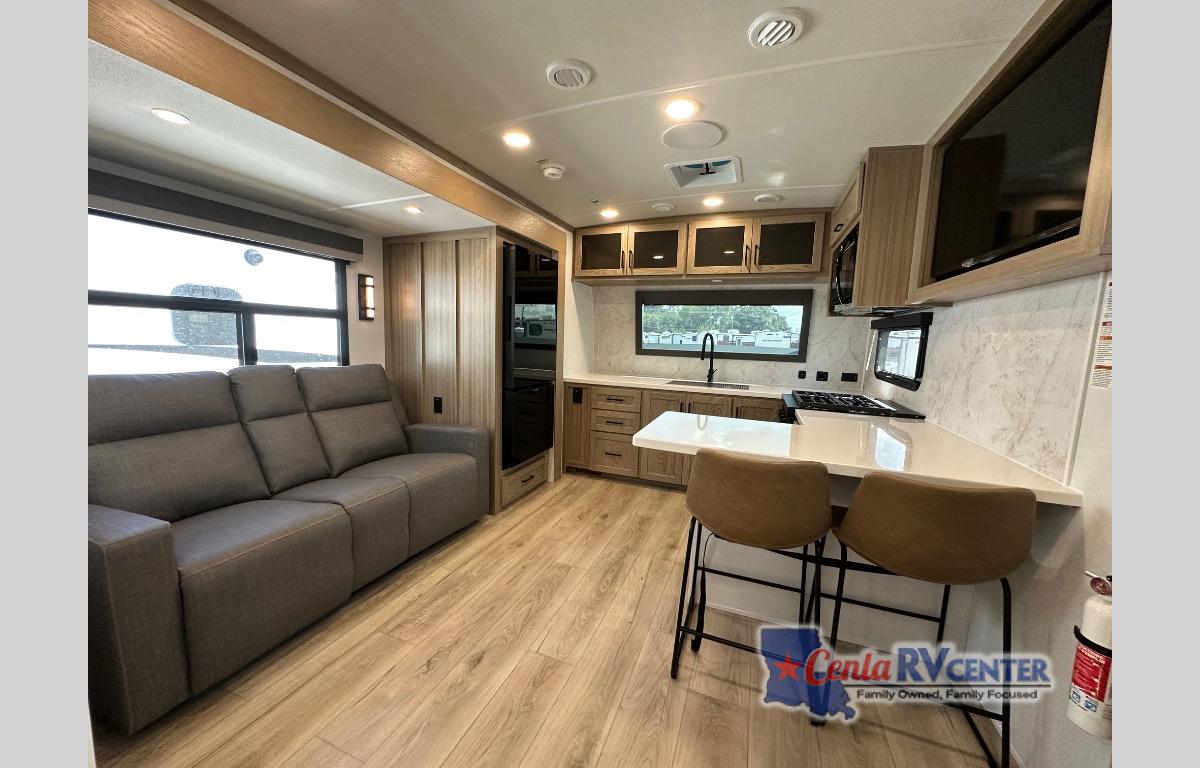 This front kitchen, couple's trailer is ready for adventure when you are! Once you arrive at your destination, prepare a quick lunch on the outside griddle, and enjoy the shade provided by the 19' power awning. You can eat outside, or inside at the counter with stools. The theatre seat will make this travel trailer feel more like home, and the double slides provide more space to stretch out. Within the master bedroom you'll find a king bed, a large wardrobe and a dresser, plus an optional TV. And check out the full rear bath with dual bath sinks and a shower with a seat! Now, that's what I call comfort!