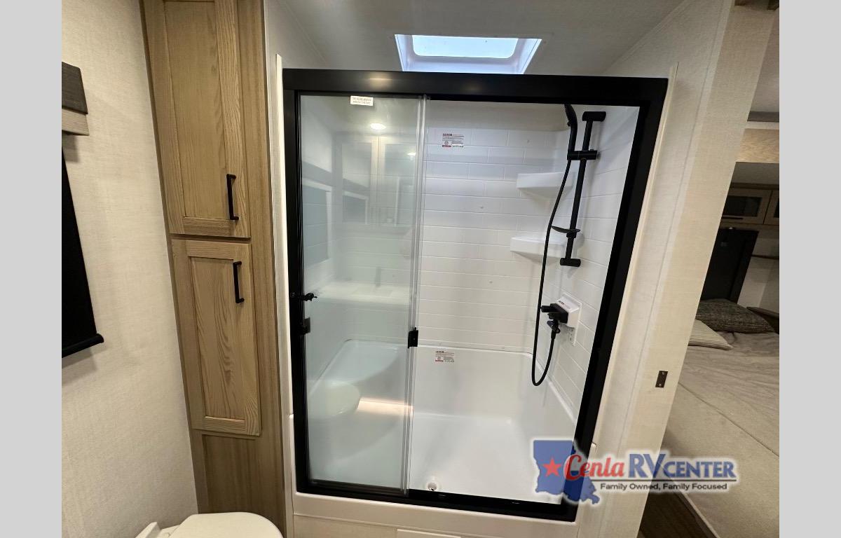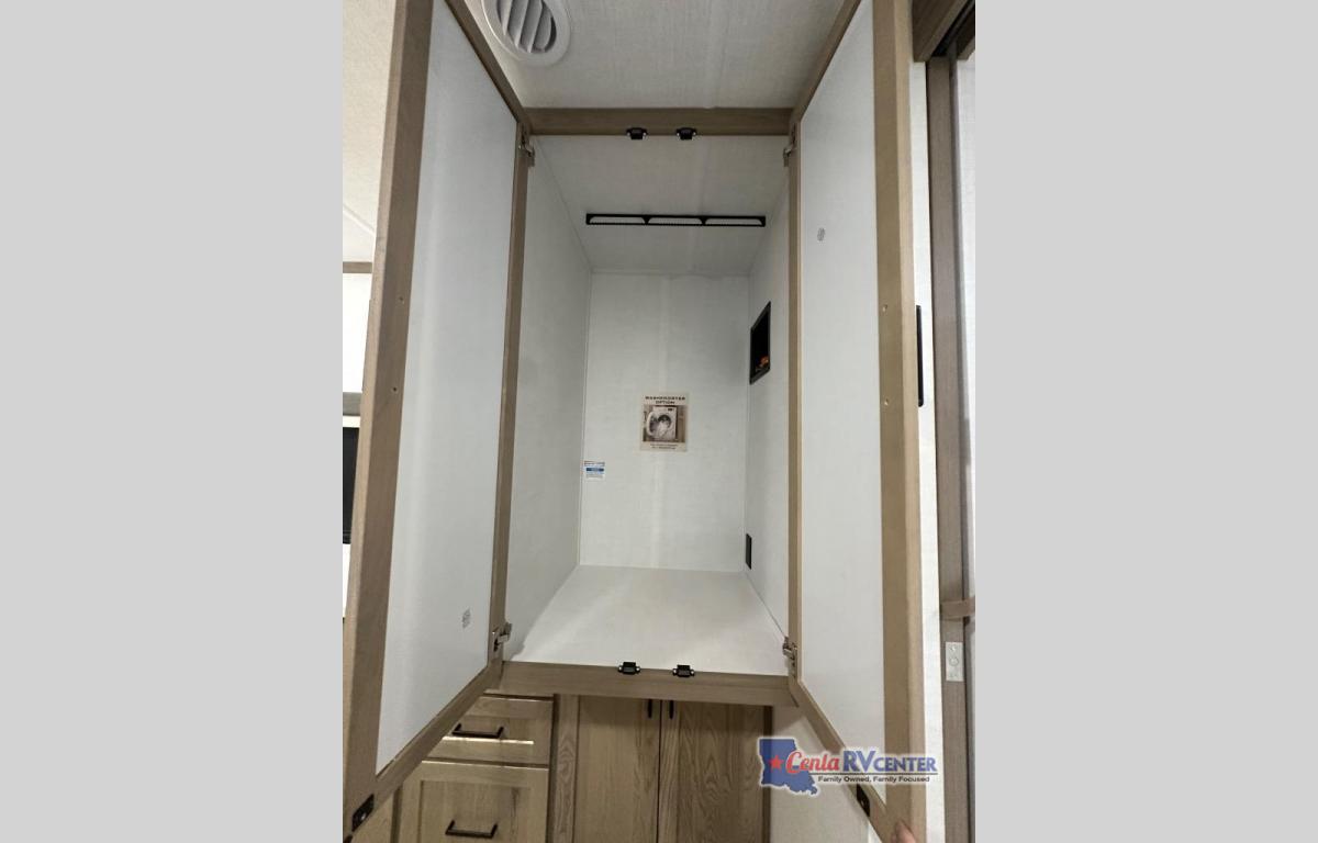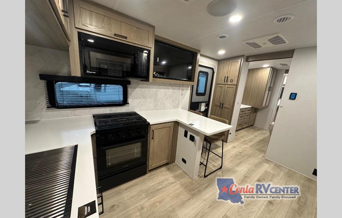 This front kitchen, couple's trailer is ready for adventure when you are! Once you arrive at your destination, prepare a quick lunch with the Griddle Prep, and enjoy the shade provided by the 19' power awning. You can eat outside, or inside at the counter with stools. The 67" theatre seat will make this travel trailer feel more like home, and the double slides provide more space to stretch out. Within the master bedroom you'll find a king bed, a large wardrobe and a dresser, plus an optional TV. And check out the full rear bath with dual bath sinks and a shower with a seat! Now, that's what I call comfort!