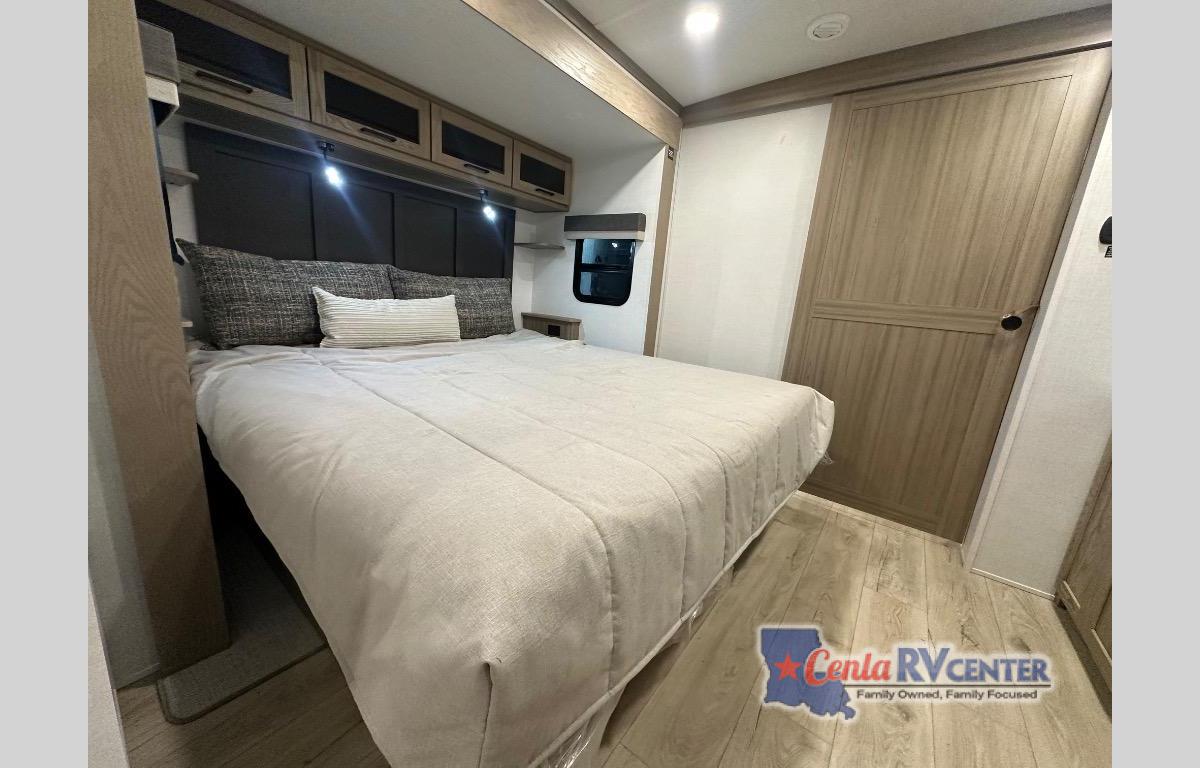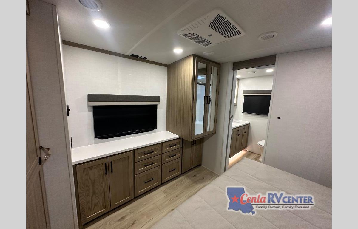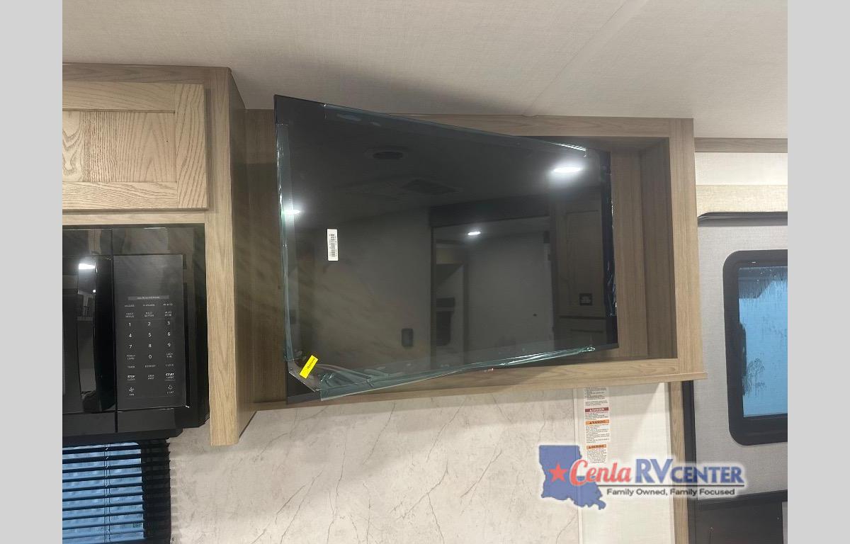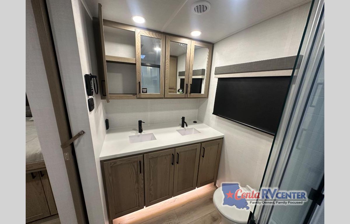This front kitchen, couple's trailer is ready for adventure when you are! Once you arrive at your destination, prepare a quick lunch with the Griddle Prep, and enjoy the shade provided by the 19' power awning. You can eat outside, or inside at the counter with stools. The 67" theatre seat will make this travel trailer feel more like home, and the double slides provide more space to stretch out. Within the master bedroom you'll find a king bed, a large wardrobe and a dresser, plus an optional TV. And check out the full rear bath with dual bath sinks and a shower with a seat! Now, that's what I call comfort!