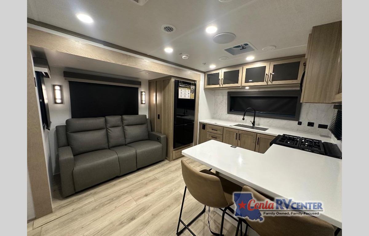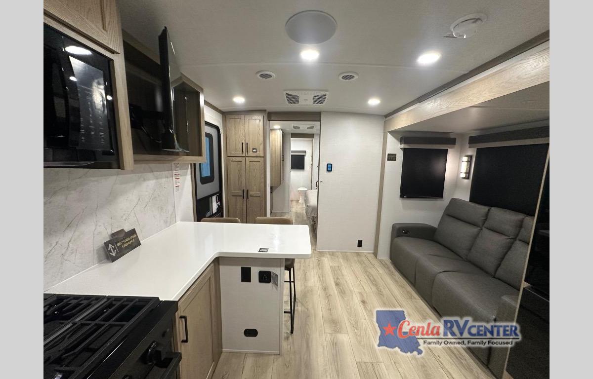 This front kitchen, couple's trailer is ready for adventure when you are! Once you arrive at your destination, prepare a quick lunch with the Griddle Prep, and enjoy the shade provided by the 19' power awning. You can eat outside, or inside at the counter with stools. The 67" theatre seat will make this travel trailer feel more like home, and the double slides provide more space to stretch out. Within the master bedroom you'll find a king bed, a large wardrobe and a dresser, plus an optional TV. And check out the full rear bath with dual bath sinks and a shower with a seat! Now, that's what I call comfort!