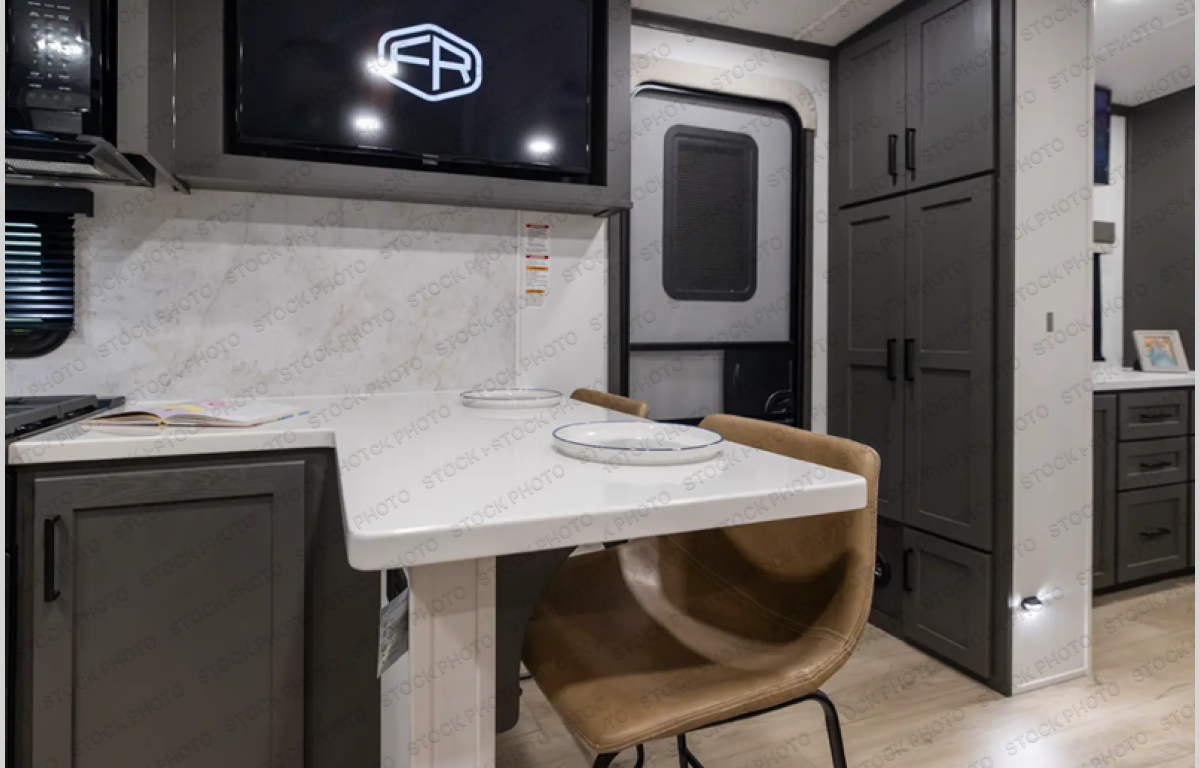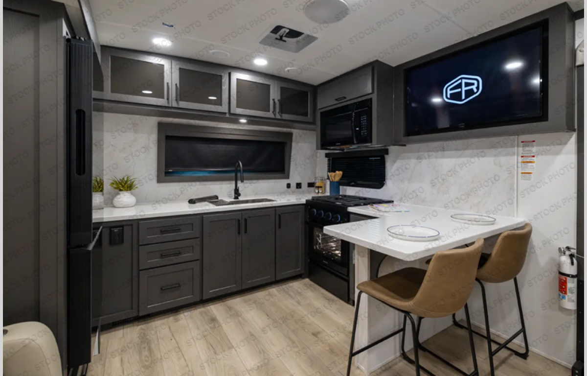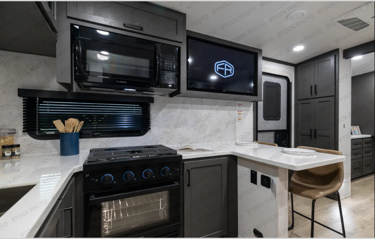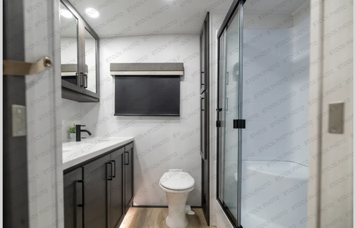 This front kitchen, couple's trailer is ready for adventure when you are! Once you arrive at your destination, prepare a quick lunch with the Griddle Prep, and enjoy the shade provided by the 19' power awning. You can eat outside, or inside at the counter with stools. The 67" theatre seat will make this travel trailer feel more like home, and the double slides provide more space to stretch out. Within the master bedroom you'll find a king bed, a large wardrobe and a dresser, plus an optional TV. And check out the full rear bath with dual bath sinks and a shower with a seat! Now, that's what I call comfort!