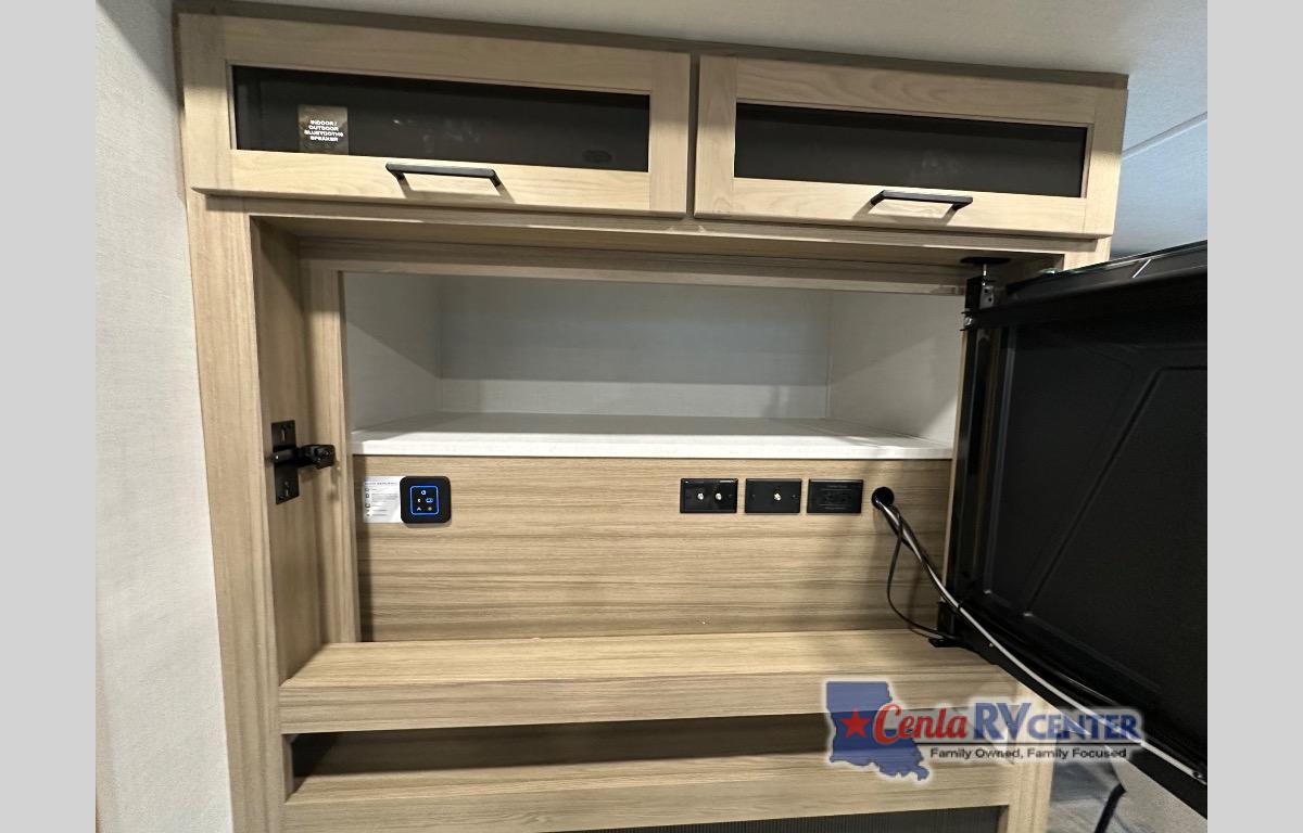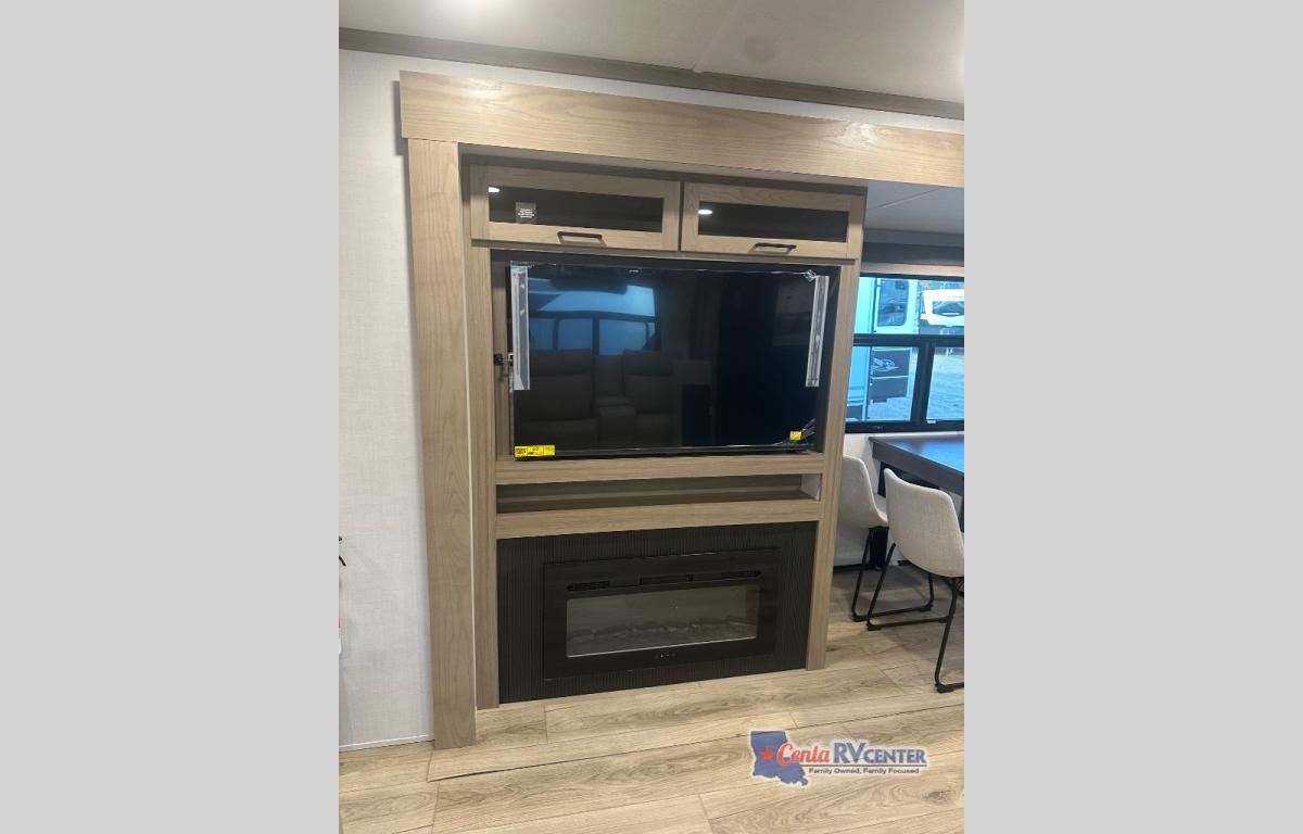 One step inside this rear kitchen travel trailer and you'll be sold! The dual opposing slides create an open floorplan you are sure to love, and you'll find plenty of seating spaces on the theater seat, the hide-a-bed sofa, and the table, chairs & bench. There is an entertainment center here with a Smart TV, plus a fireplace for those cooler nights. The full bath includes a shower with a seat, and the front private bedroom includes a queen bed slide out for more floor space. You can easily store your items in the large front wardrobe, plus there is a dresser and additional storage with washer and dryer prep. And check out the exterior with two power awnings, an outside kitchen, plus exterior storage for all your gear!